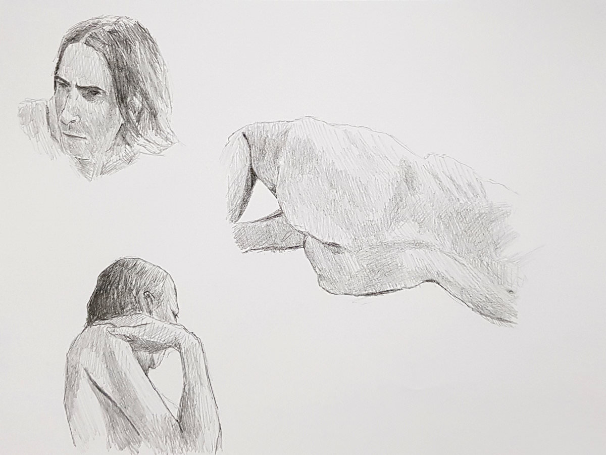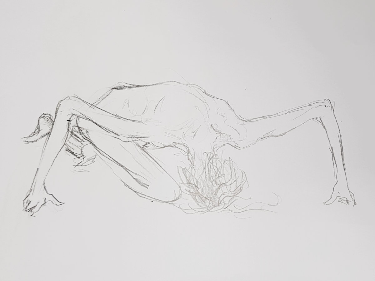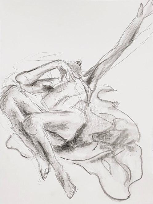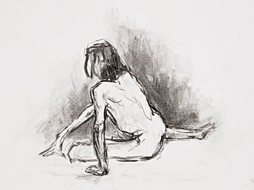 Our leader made the astute call that, as they would not be getting the benefit of Lily’s expert tuition during each study, they should instead enjoy an evening of short poses. We opened with five of 2 minutes, continued with three of 5 minutes, and finished the first half with two of 10-minutes. In a starkly-lit room, my trusty white sheet upon grey carpet tiles within an oval of white desks, I tilted and turned and twisted till the break.