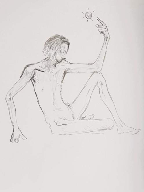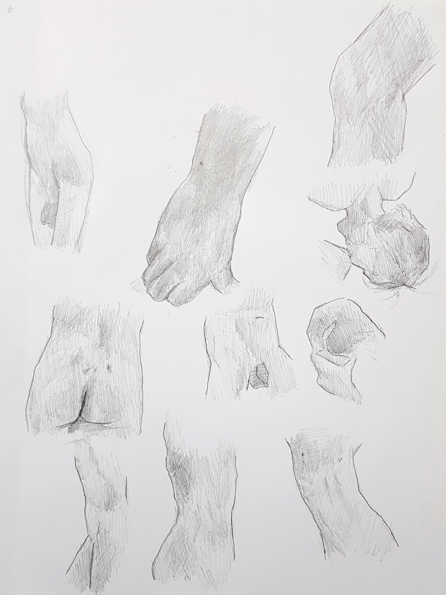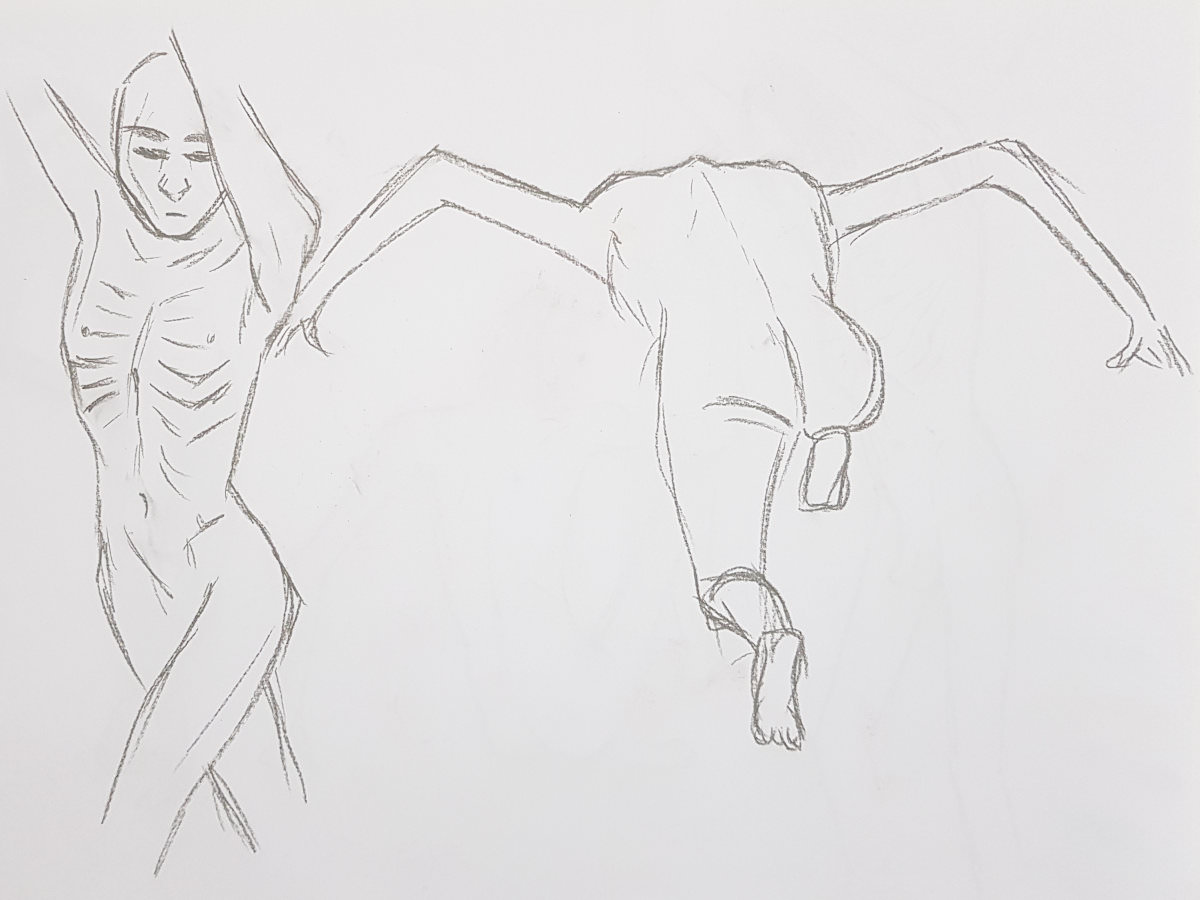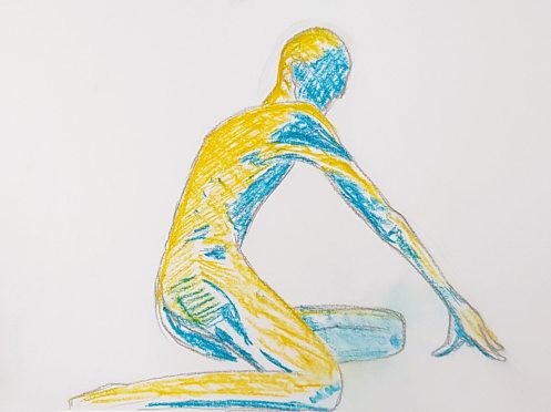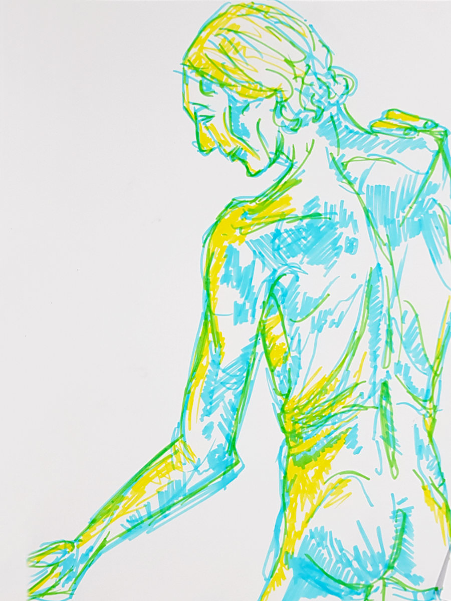 Our leader made the astute call that, as they would not be getting the benefit of Lily’s expert tuition during each study, they should instead enjoy an evening of short poses. We opened with five of 2 minutes, continued with three of 5 minutes, and finished the first half with two of 10-minutes. In a starkly-lit room, my trusty white sheet upon grey carpet tiles within an oval of white desks, I tilted and turned and twisted till the break.