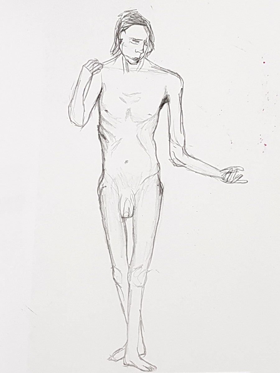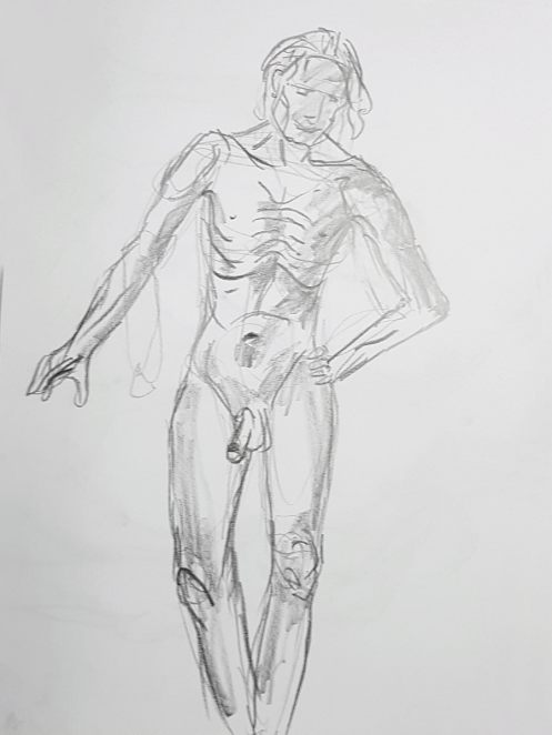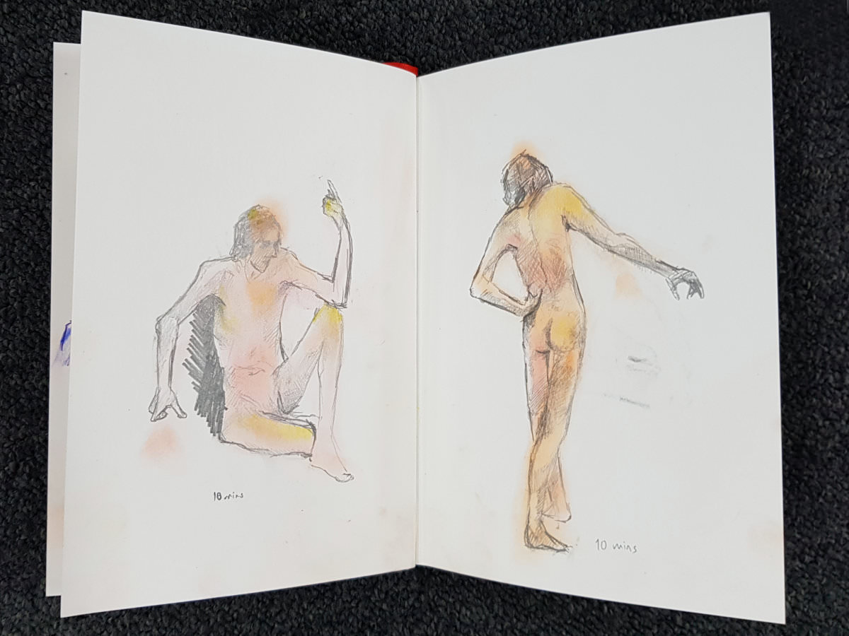 Leadership responsibilities passed to one of the half-dozen students who arrived first. She accepted the burden with admirable grace, taking us into the Chadwick Building, guiding us along corridors to a far room, and promptly reorganising tables and chairs. It seemed a vast space for such a small group; but then more arrived, and more, and yet more, until at 6pm I was naked on one leg in front of over 30 young artists.