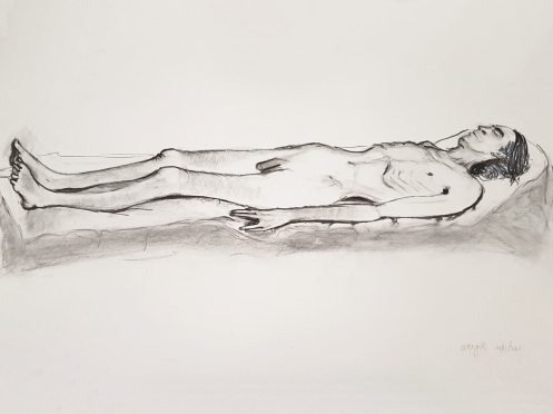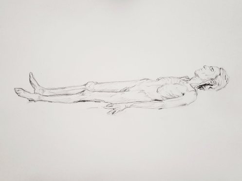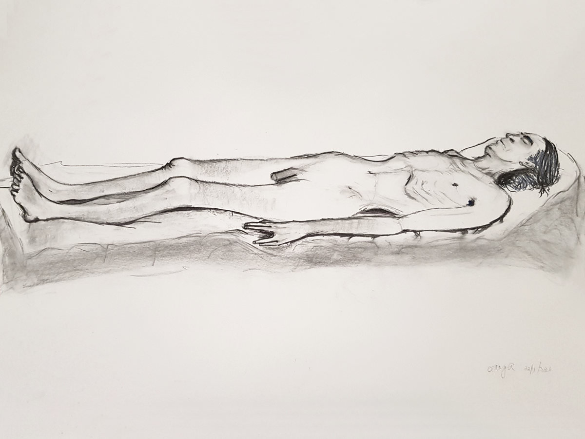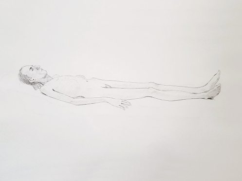 In preparation for the long pose we cleared a space in the middle of the studio, swept the floor, put down three or four layers of foam, added a cushion support for my head, then covered the whole lot with my own white sheet. And there I lay down naked. The pose seemed so simple I felt I should at least attempt to add something, so I crossed my ankles. Tsk tsk. I was told to uncross! I wasn’t to do, I was just to be… simple.
