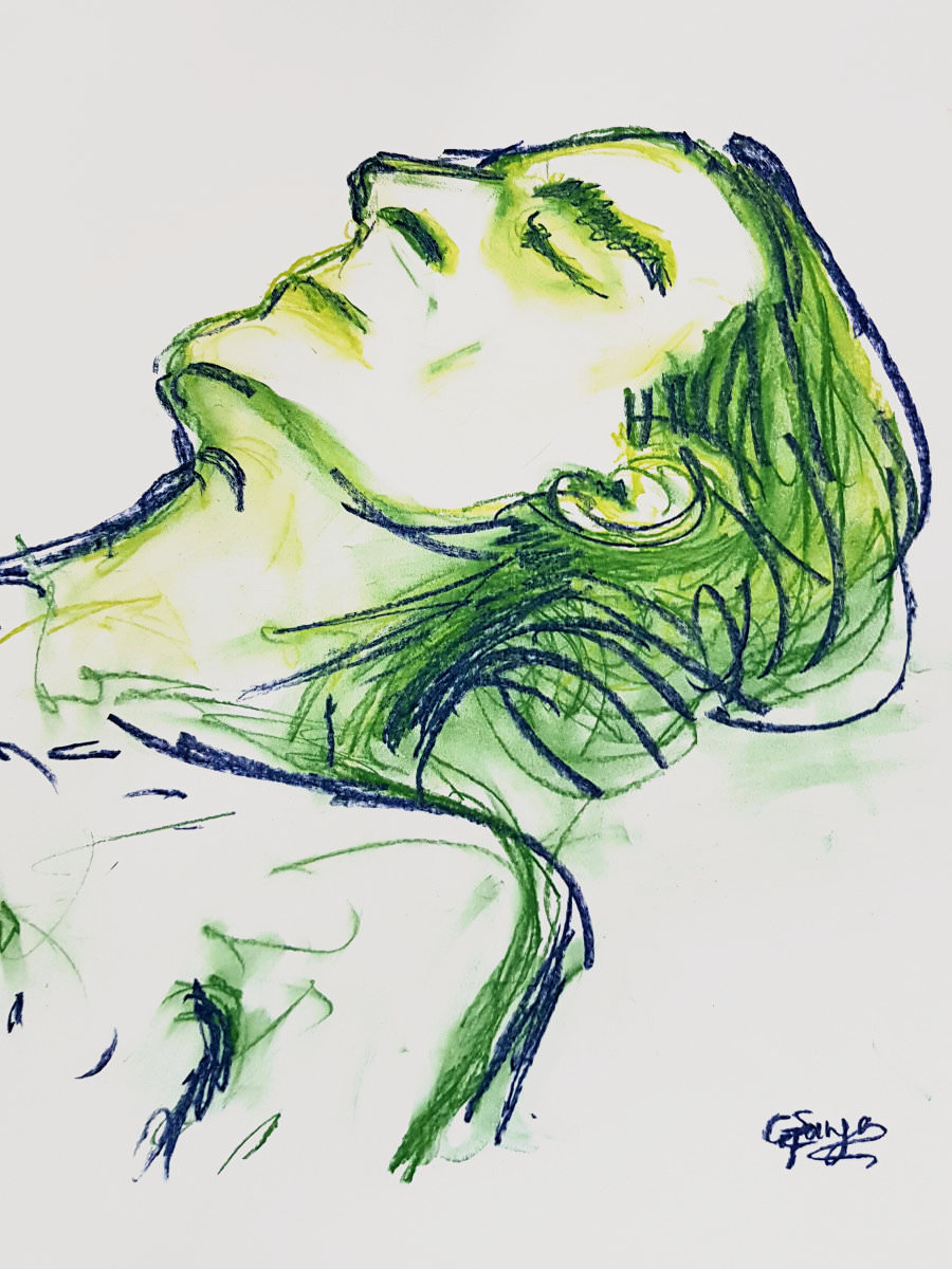 I always take great pains to be punctual so something fairly dramatic has to occur for me not to arrive in good time. In a decade of modelling it’s happened only twice; both occasions arising from catastrophic rail problems. This evening also: a train failure at Blackheath station meant the whole line was kaput. And I’d planned to be 20 minutes early! Oh well. We still had time for warm-ups: three 1-minute poses, one 5-minute.