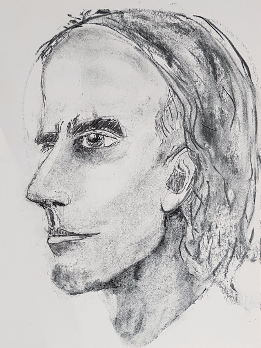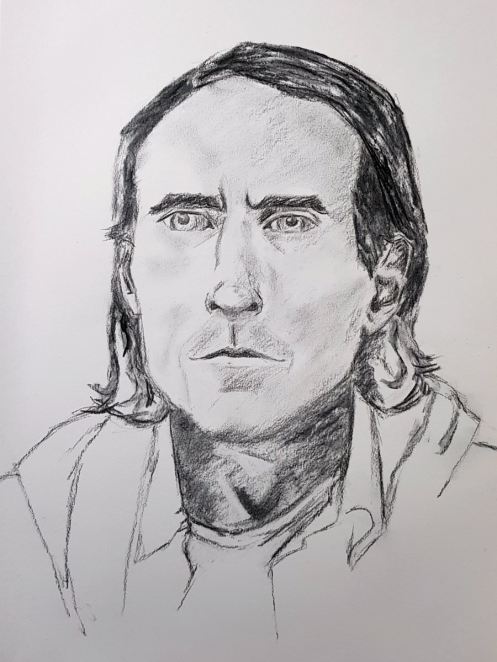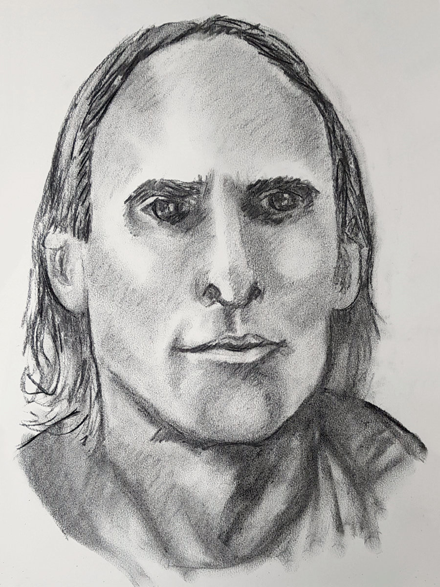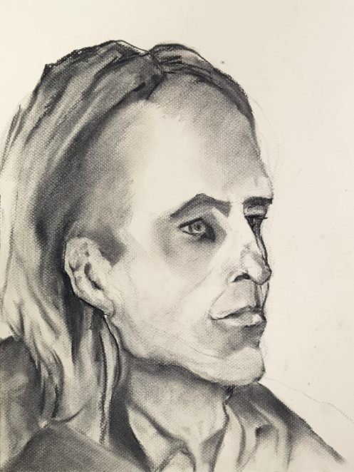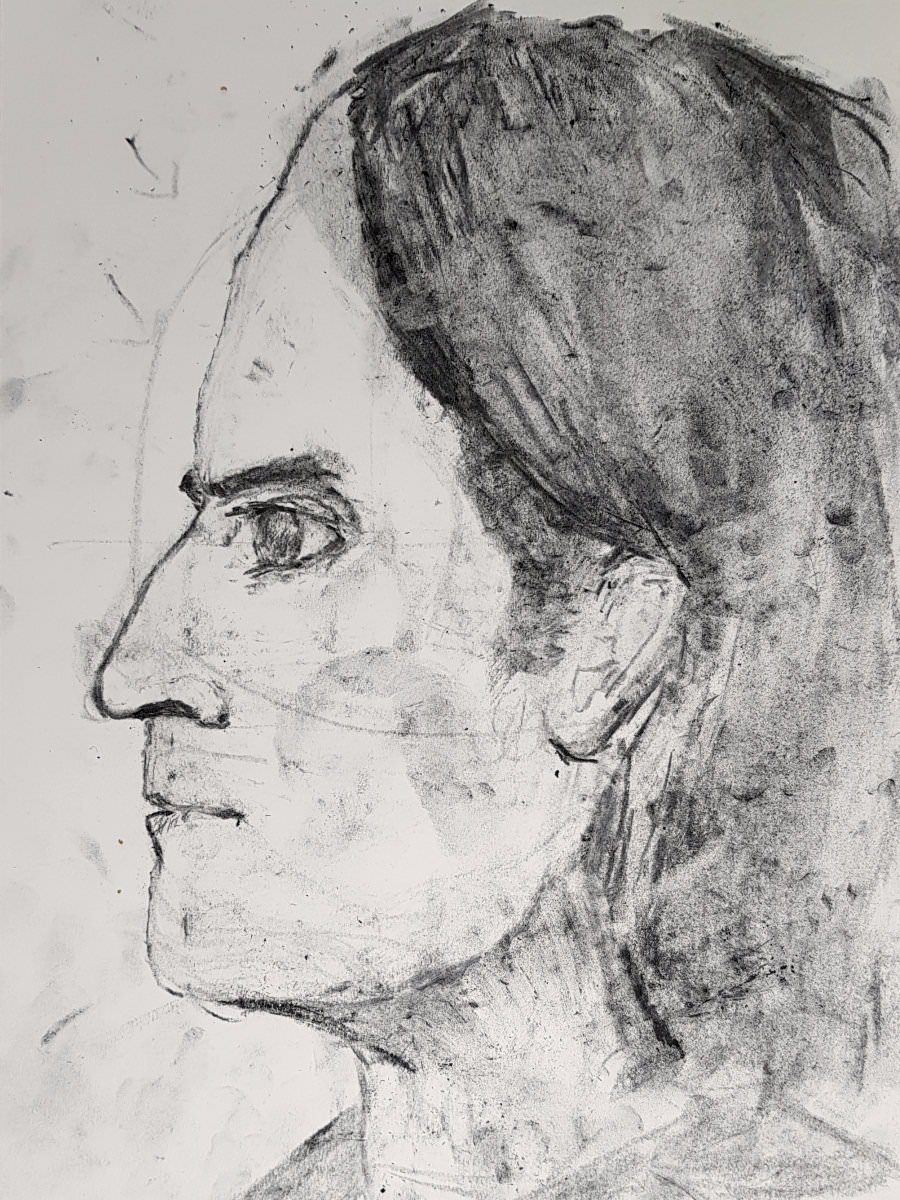 I’m happy when art groups play music while I’m modelling, but I’m even happier when there’s fascinating tuition to eavesdrop. I love learning new things. For example, don’t shade-in 5 o’clock beard growth before capturing the shadows that define structure. It seems obvious when I think about it but I’d never heard it said before. Such first class guidance – clear, focused and practical – was given from blank page to final marks.