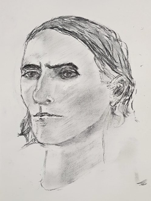 Being well over six feet tall I had no chance of standing up straight, but then that’s not why I was there. Instead I was to be seated within a horseshoe of tables from which a half-dozen artists would observe and draw me: face-on, three-quarter face or profile. I don’t usual take my seat till the last minute for portrait poses but it seemed sensible to make this an exception rather than stand with one ear pressed against the ceiling.