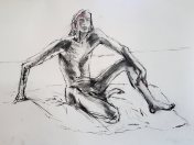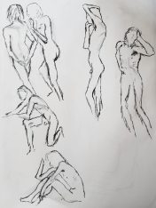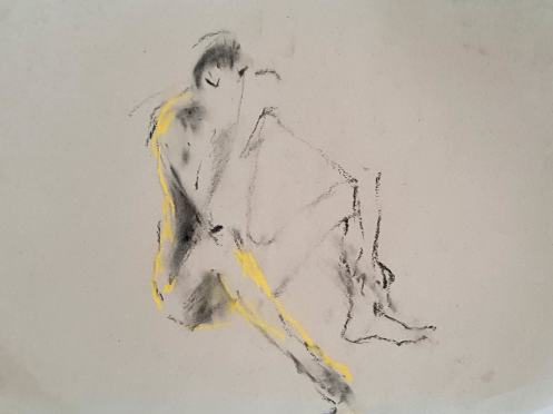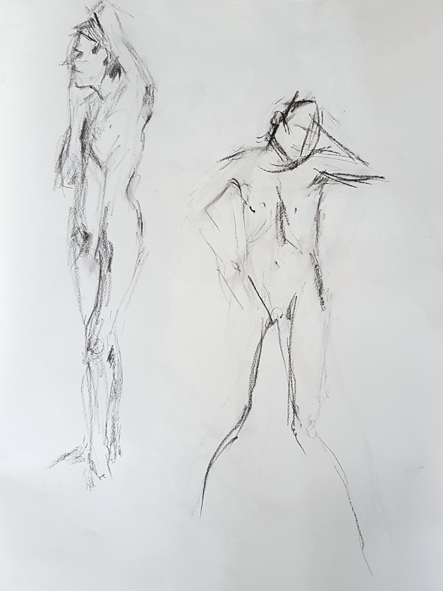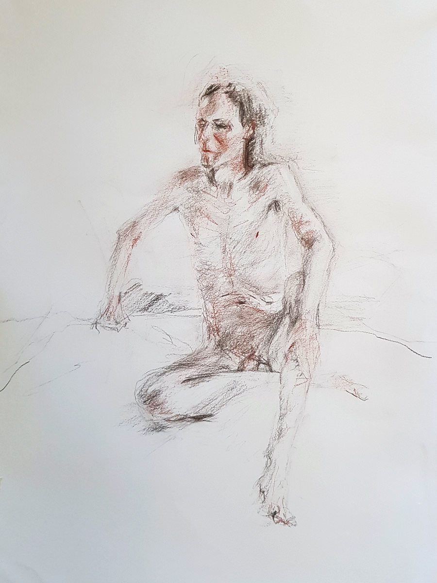 Two and a half weeks after agreeing, as I walked to the venue in temperatures barely above freezing, my game-for-anything attitude was more subdued. It came as a huge relief when I walked through the door and was told the heating had been repaired the day before! Lucky me. We could have a full life drawing session in comfort, beginning with six poses of 5 minutes, ten of 1 minute, and the first 45 minutes of a long pose.