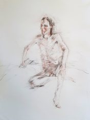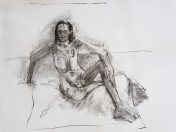 I was offered all sorts of options for the long pose but chose to be seated on the floor. With a fan heater on either side and a pile of soft furnishings beneath me, I was cosy enough not to need a stretch break. A mug of tea – my second since arriving – and a few dark chocolate digestives were, nonetheless welcome respite during the interval. Walking around, it was clear that drawings were coming along very nicely.