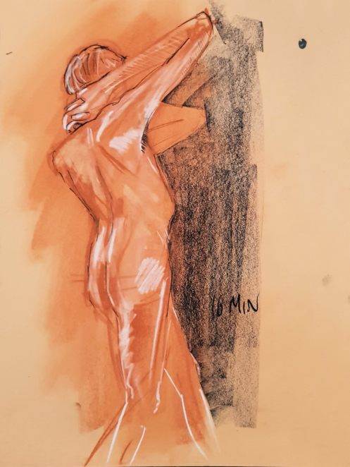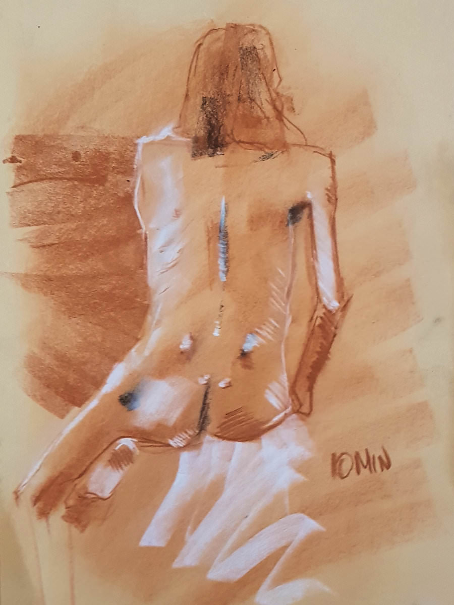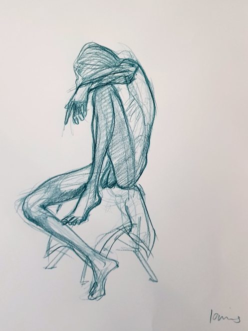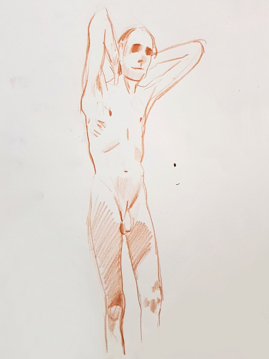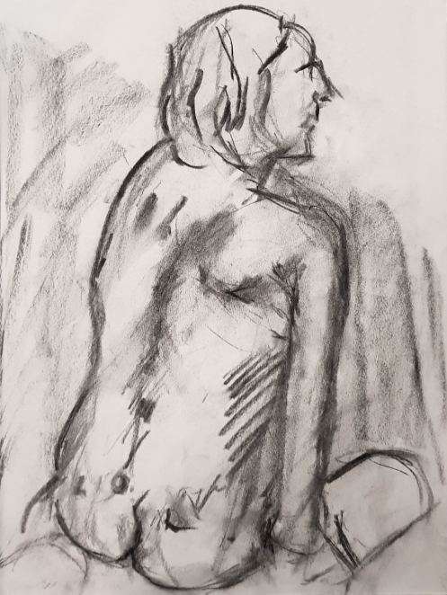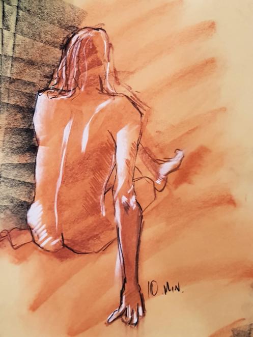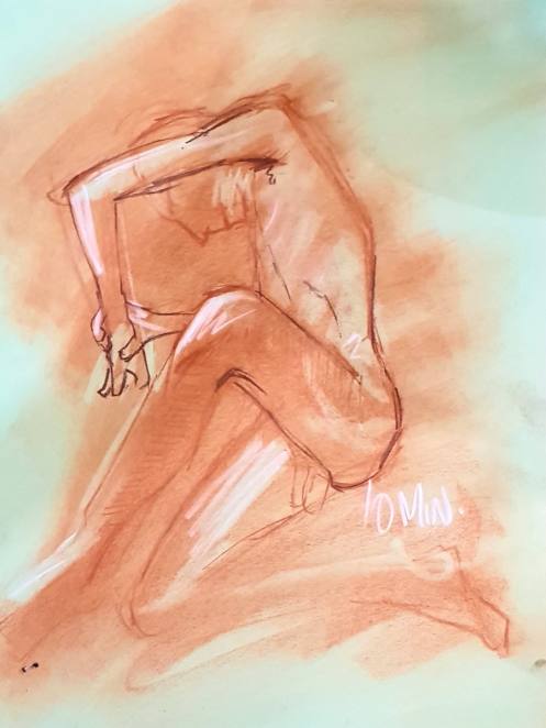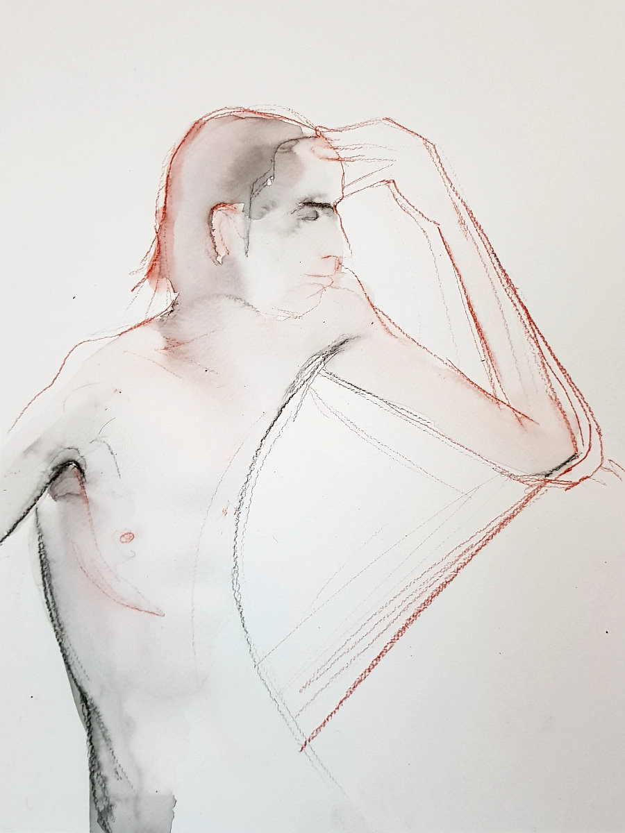 The 10-minute poses must have gone down well – when Catherine offered her artists the option of either three more 10-minute poses, two 15s, a 10 and a 20, or one 30 to complete the session, they voted for 10s. That suited me just fine. I stood for the first, both hands around the back of my neck; I semi-reclined for the second, limbs making angles and negative space; I sat for the third, elbow on knee, fingertips on forehead.
