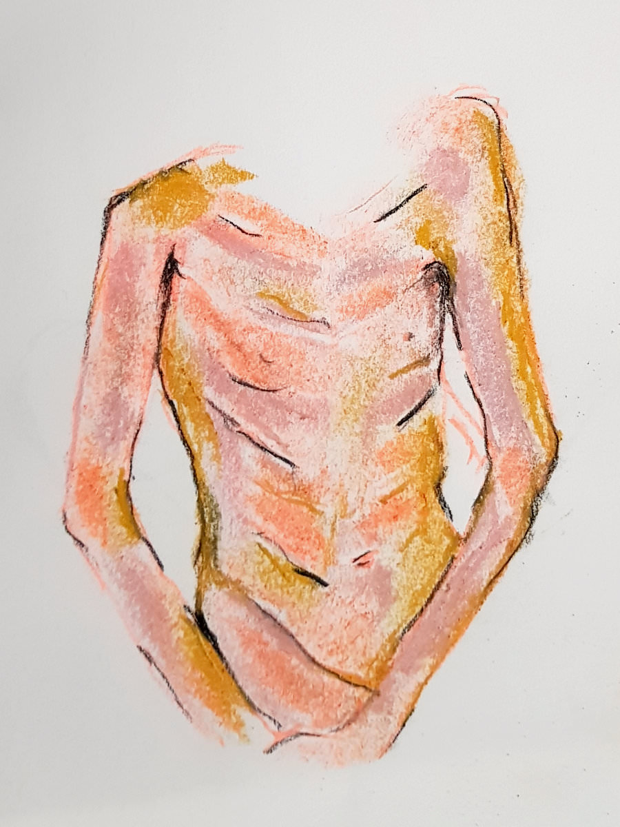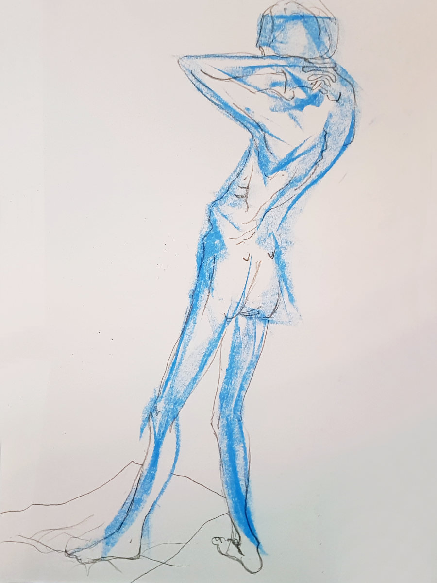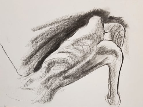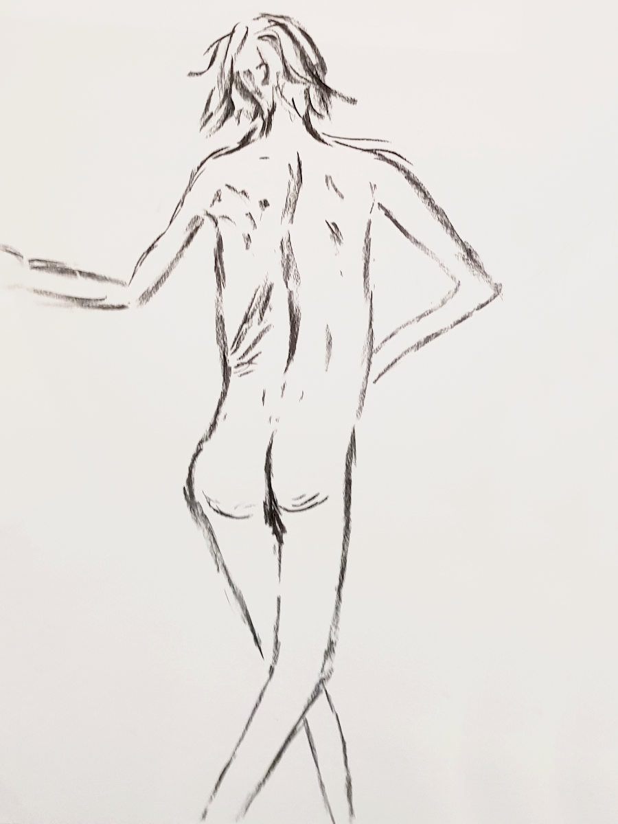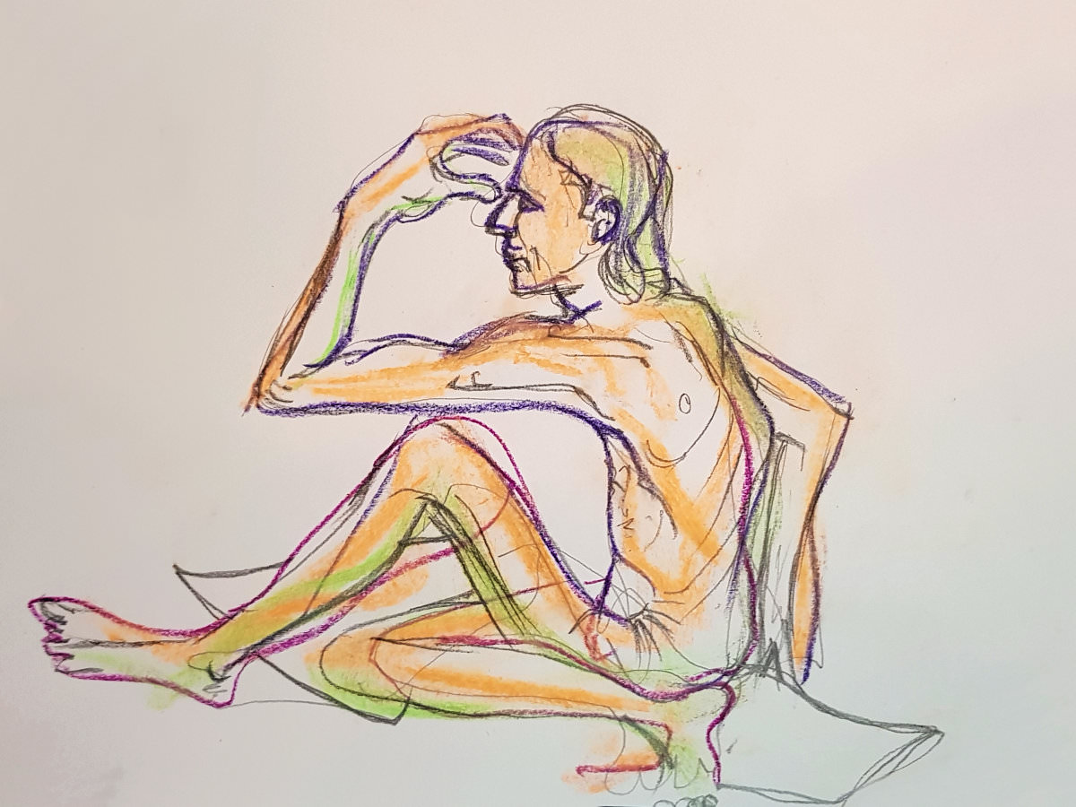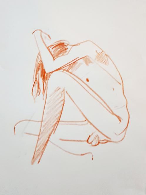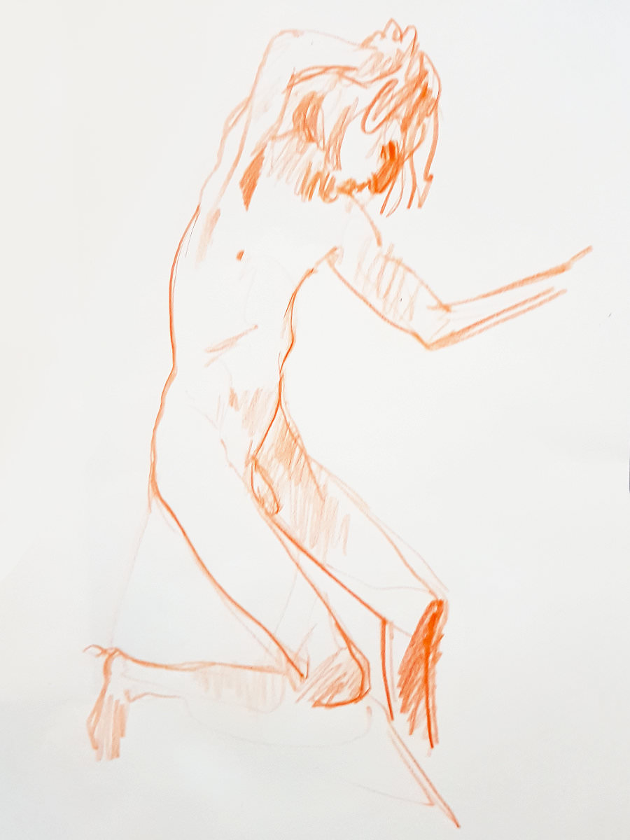 The 10-minute poses must have gone down well – when Catherine offered her artists the option of either three more 10-minute poses, two 15s, a 10 and a 20, or one 30 to complete the session, they voted for 10s. That suited me just fine. I stood for the first, both hands around the back of my neck; I semi-reclined for the second, limbs making angles and negative space; I sat for the third, elbow on knee, fingertips on forehead.