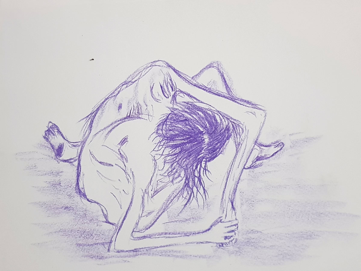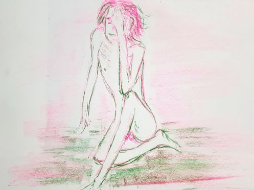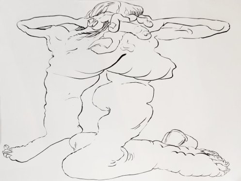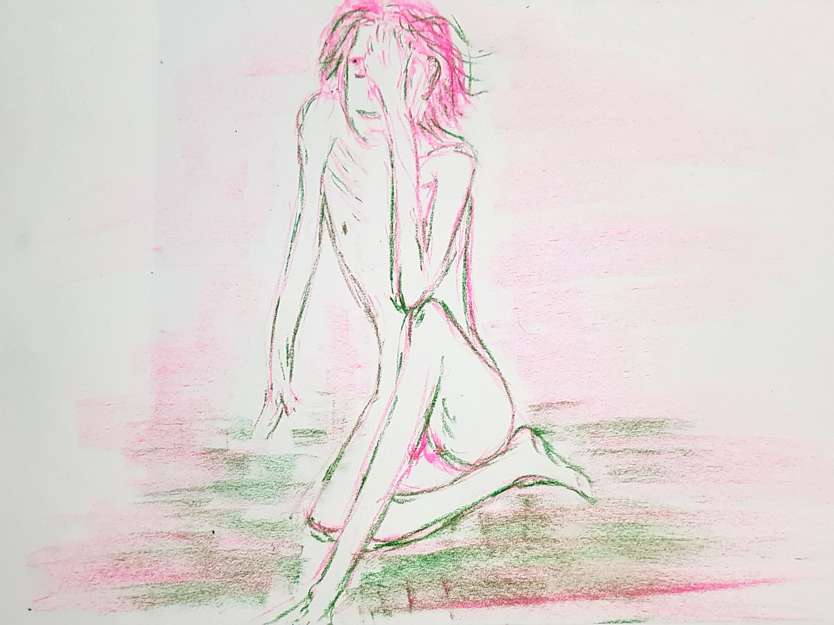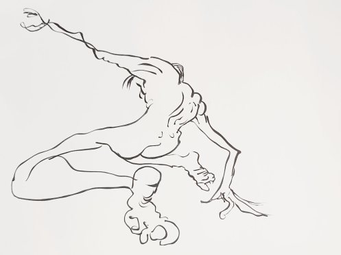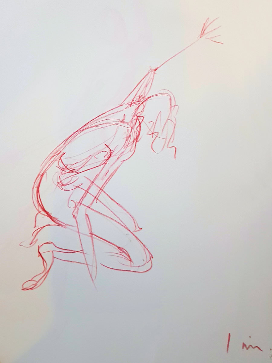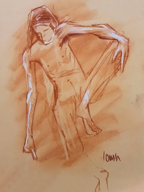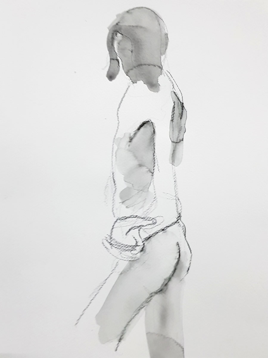 The 10-minute poses must have gone down well – when Catherine offered her artists the option of either three more 10-minute poses, two 15s, a 10 and a 20, or one 30 to complete the session, they voted for 10s. That suited me just fine. I stood for the first, both hands around the back of my neck; I semi-reclined for the second, limbs making angles and negative space; I sat for the third, elbow on knee, fingertips on forehead.