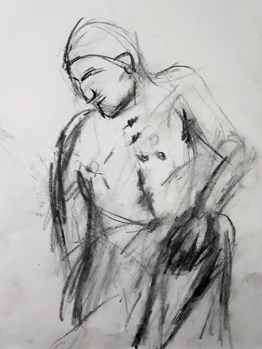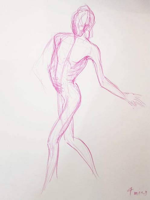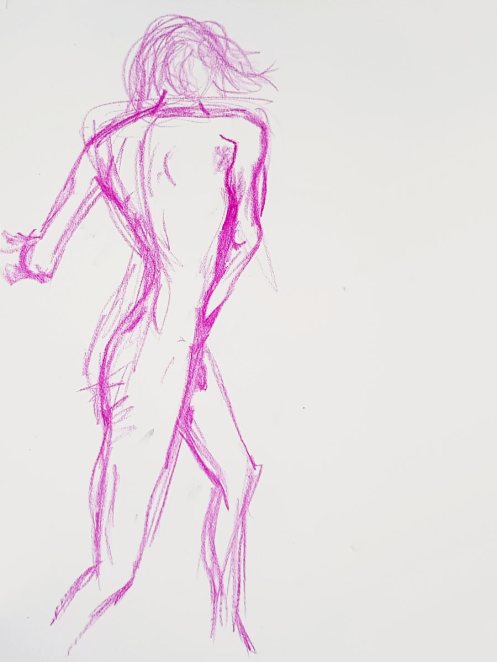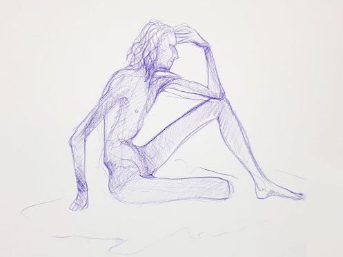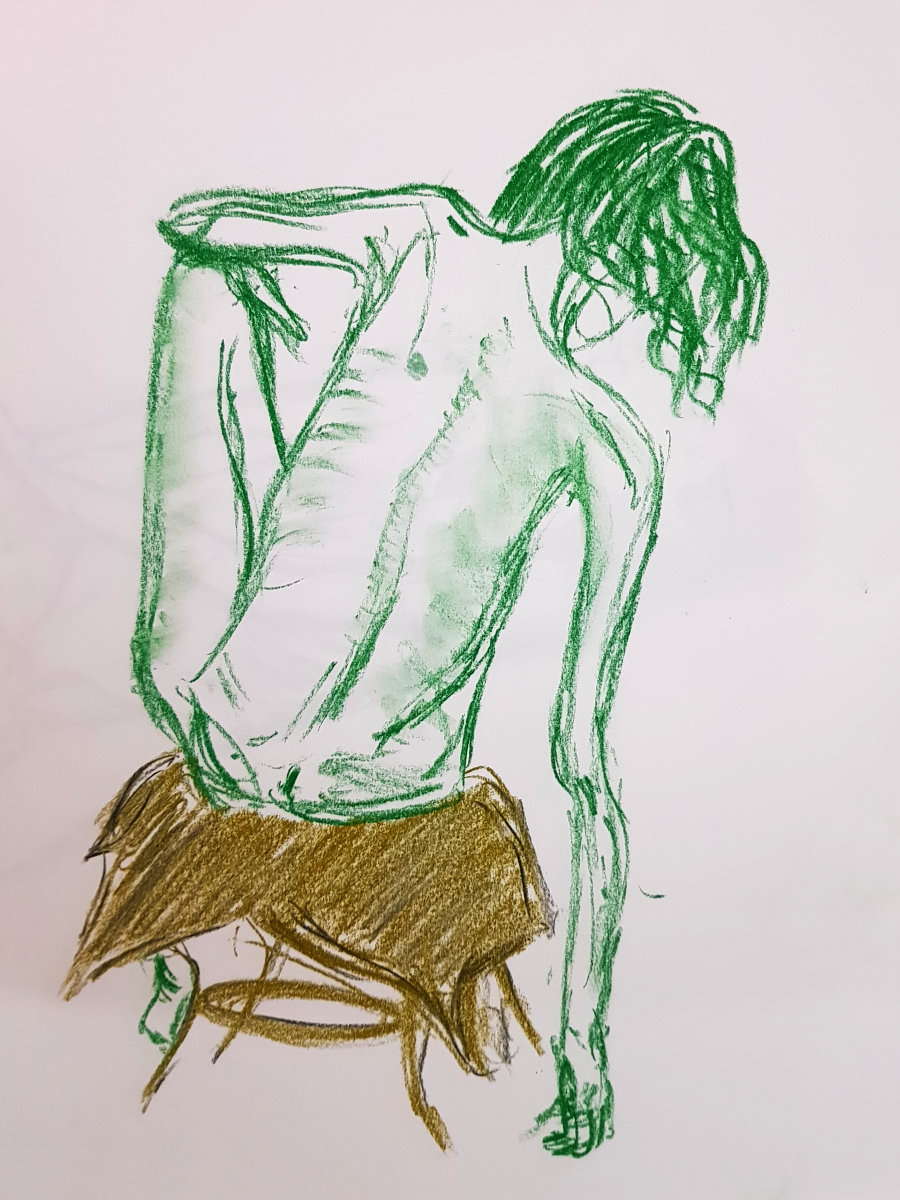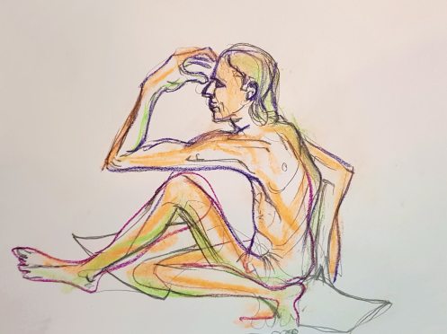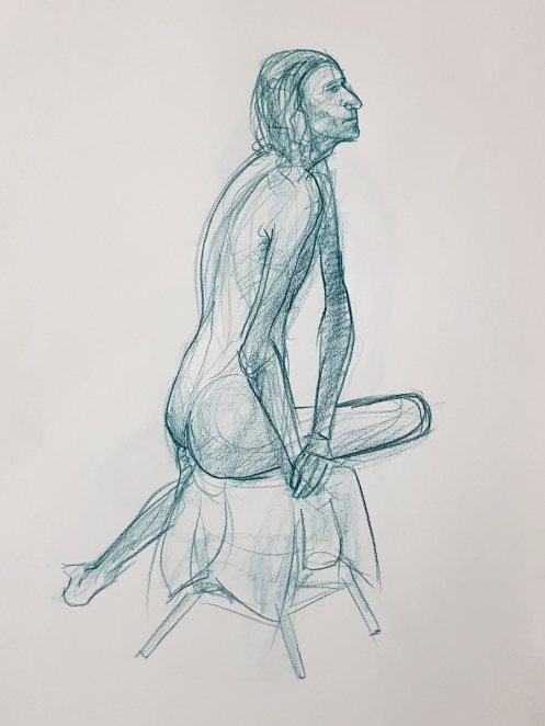 5 minutes, 4 minutes, 3 minutes, 2 minutes, three of 1 minute, three of 30 seconds. If any artist wanted warming-up, they got their wish. Catherine’s playlist urged them yet faster, reaching a crescendo of buzzsaw acoustic guitar as they attempted to capture all six-foot-four of me in just half a minute. After this, at 10 minutes each, the final two poses before our break were comparatively sedate.