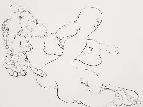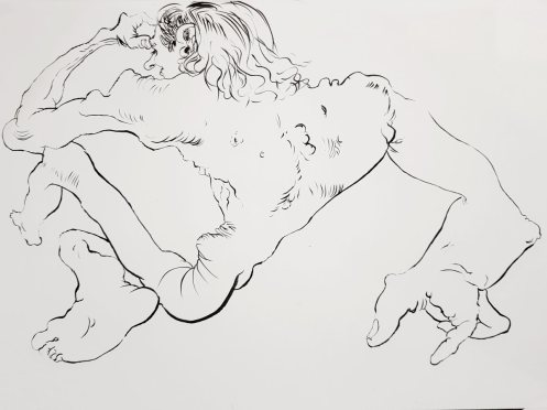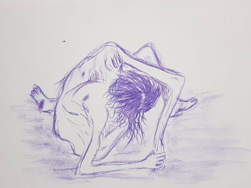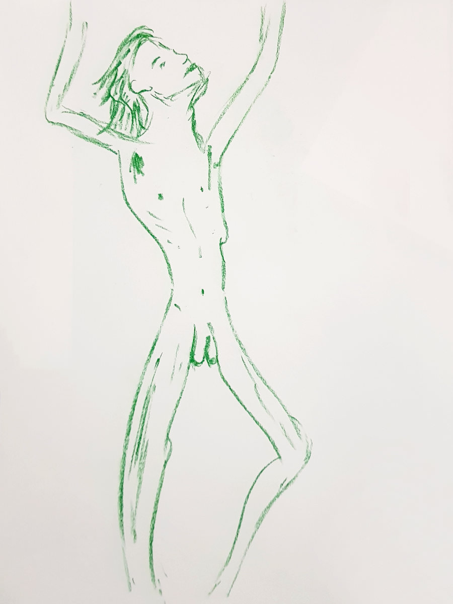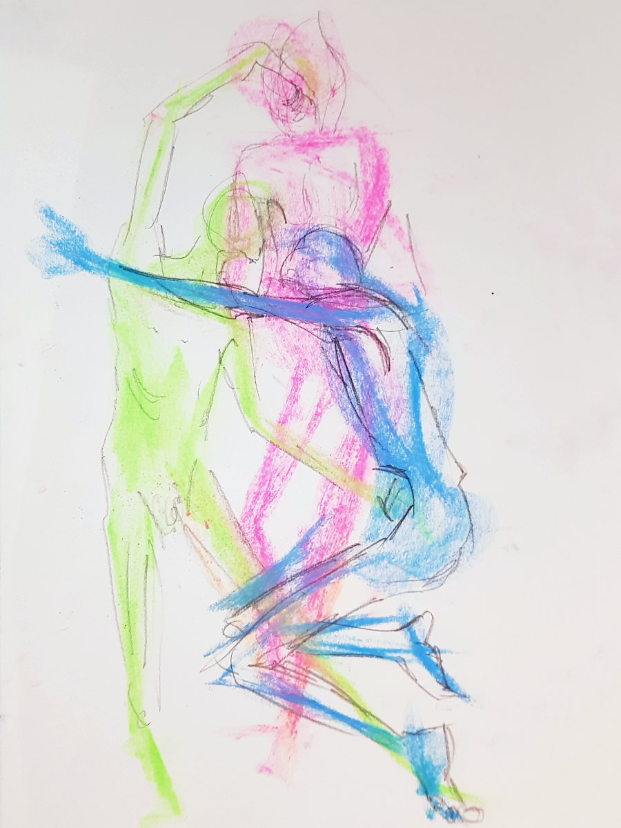 5 minutes, 4 minutes, 3 minutes, 2 minutes, three of 1 minute, three of 30 seconds. If any artist wanted warming-up, they got their wish. Catherine’s playlist urged them yet faster, reaching a crescendo of buzzsaw acoustic guitar as they attempted to capture all six-foot-four of me in just half a minute. After this, at 10 minutes each, the final two poses before our break were comparatively sedate.