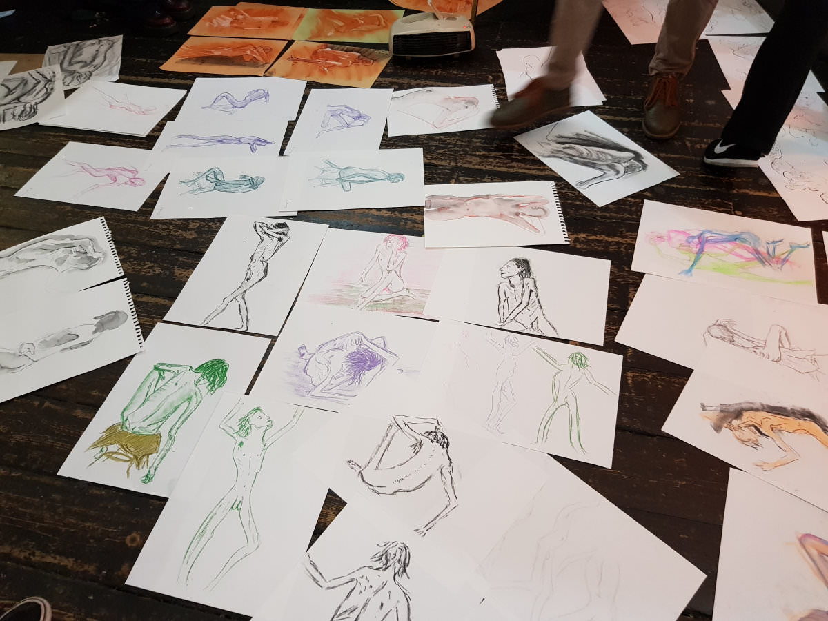 As is traditional at the end, artists placed their drawings on the floor where they could be appreciated and admired by all. So much talent in the room this evening! So many strong distinct styles too. No doubt I looked part-vain, part-insane as I tiptoed around, eagerly photographing my own image in scores of variations. But I’ll never stop being impressed by humankind’s ability and desire to keep making wonderful art.