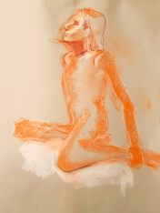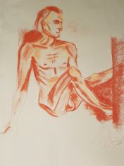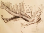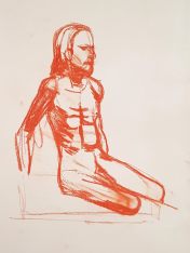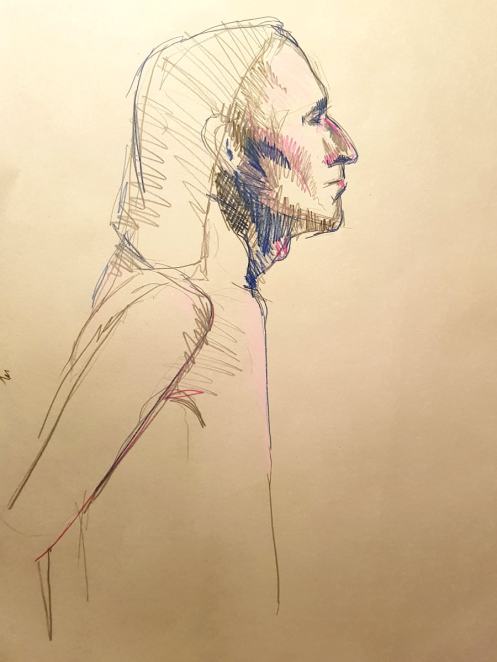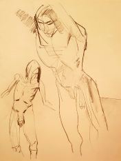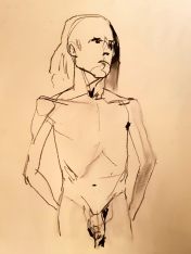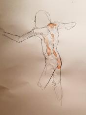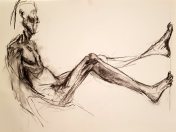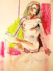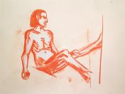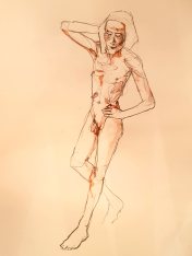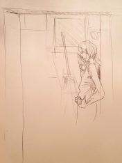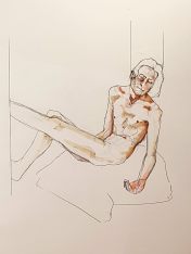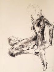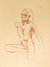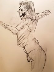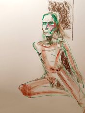 The second half was intended to provide a single pose of 40-45 minutes. So bereft of socialising had the artists been, however, that our break time over-ran and eventually there was only a half-hour left for life drawing. Just as well for me as I’d decided to sit with my feet higher up on the opposite door jamb. By the time we finished, my left leg was completely numb and I was unable to stand for a couple of minutes.