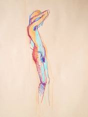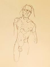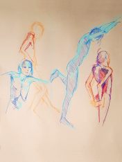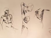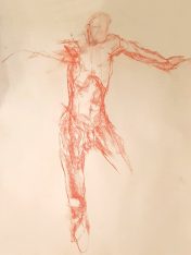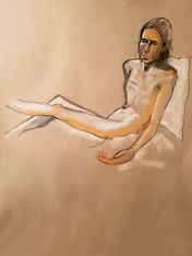 The end of a session is no time to be legless as I like to see and ideally get photos of as many artworks as possible. I fumbled into my dressing gown, hauled myself up on one leg, and gradually worked sensation back into the other so I could hobble around the easels. Restored feeling within my hitherto dead limb was not the only sensation I appreciated. So many great drawings and paintings tonight! So good to be back.