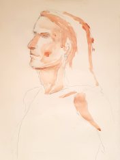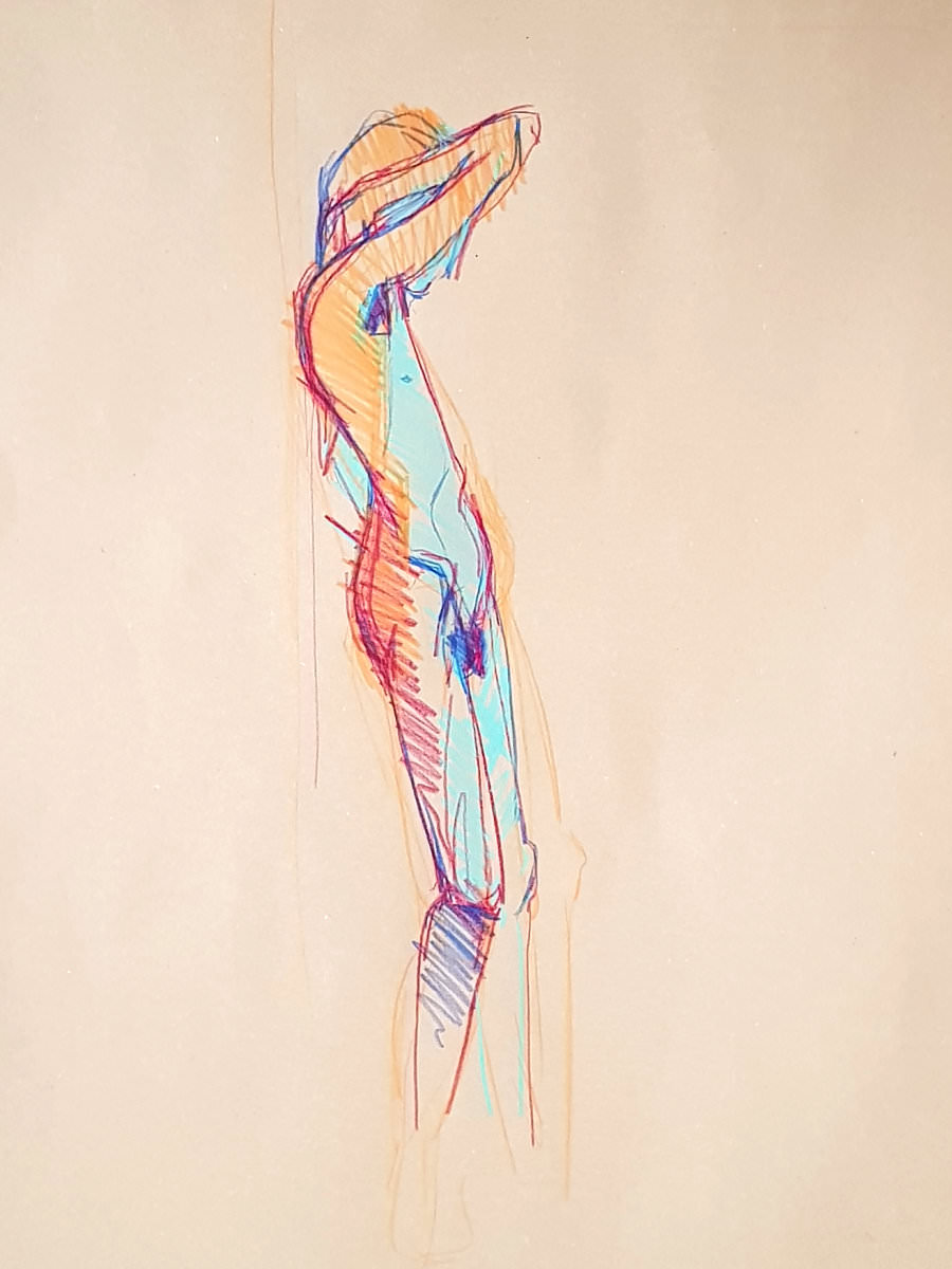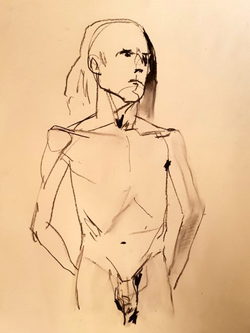 There were compromises, of course. Easels were now set further apart, meaning the two function rooms could accommodate just 14 artists instead of 20. In turn, this duly meant they could afford only one model instead of two, albeit with increased pay. But how can one model be present for 14 artists socially-distanced through two adjoining rooms? By posing in the doorway, of course. It’s limiting, but I’m up for a challenge.