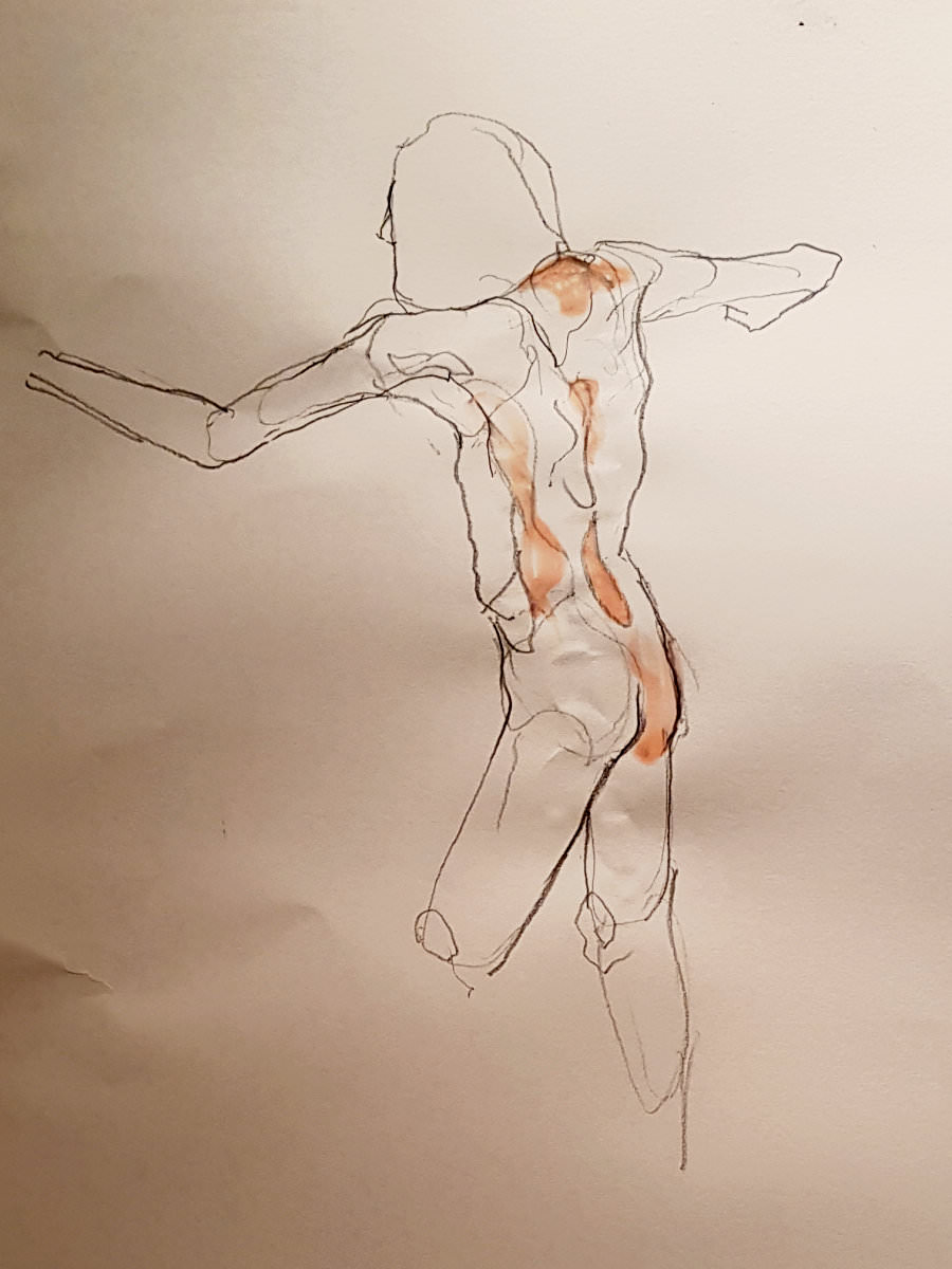 We started with four standing poses of 5-minutes each. For the first I leaned forward, forming my own arch within the door frame. Nice pose, but an unforeseen side-effect was latecomers and group organiser, Lisa, walking to and fro beneath me. I reckon it lasted more like 7 or 8 minutes, so it couldn’t have been too terribly inconvenient. My third pose also stretched to 8 minutes, prolonged on request with my willing consent.