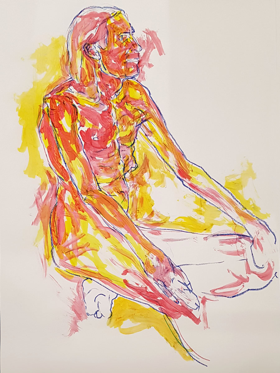 I arrive. I adjust cushions. I spread my sheet. I disrobe. I sit. I remain motionless from whenever seems about right. An hour elapses. No sounds. No speaking. A hubbub in the short-pose space eventually tells me it’s surely half-time. Yet no-one speaks here. Two walk off. Still I sit. Another minute or so. Still artists paint. Then one says, “I think that’s the break”. I have been motionless for over an hour. I put on my robe. I get tea.