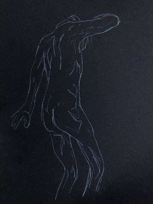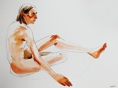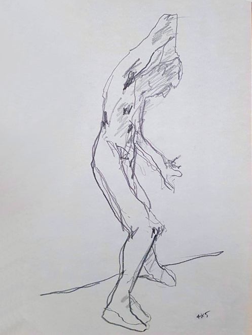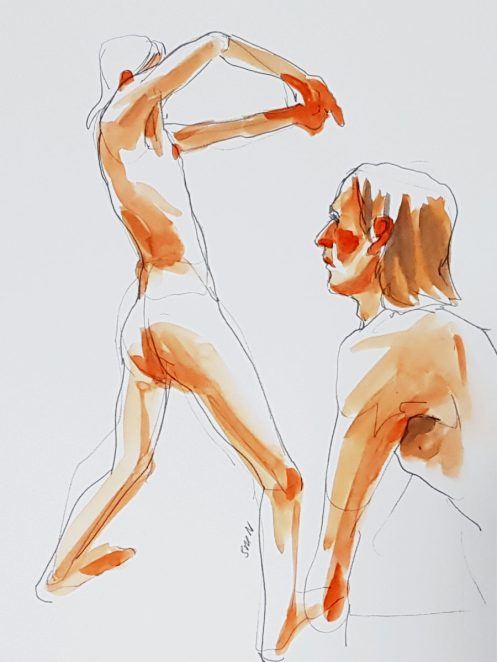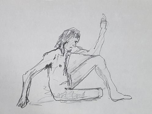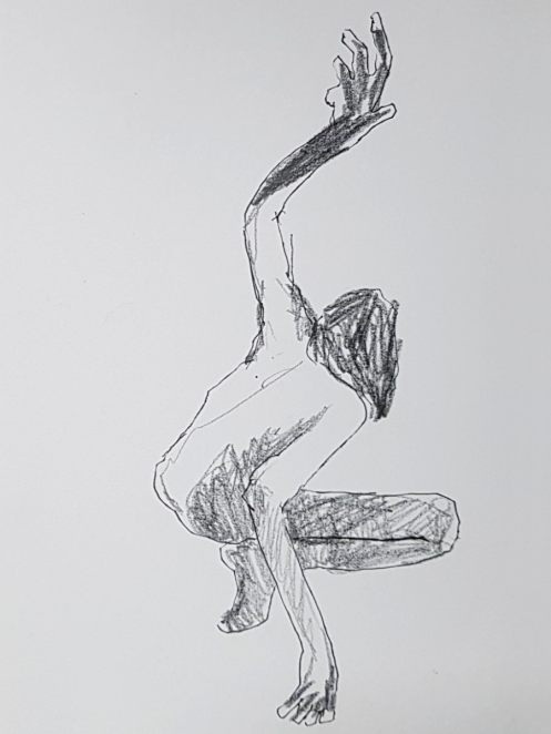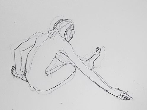 Three longer poses followed: 10 minutes sitting on the floor, 10 minutes upright, then 20 minutes on my backside again, albeit differently angled. Part of the challenge was not only to vary the poses in this session, but also to avoid repeating any I’d used my previous – very recent – visit.