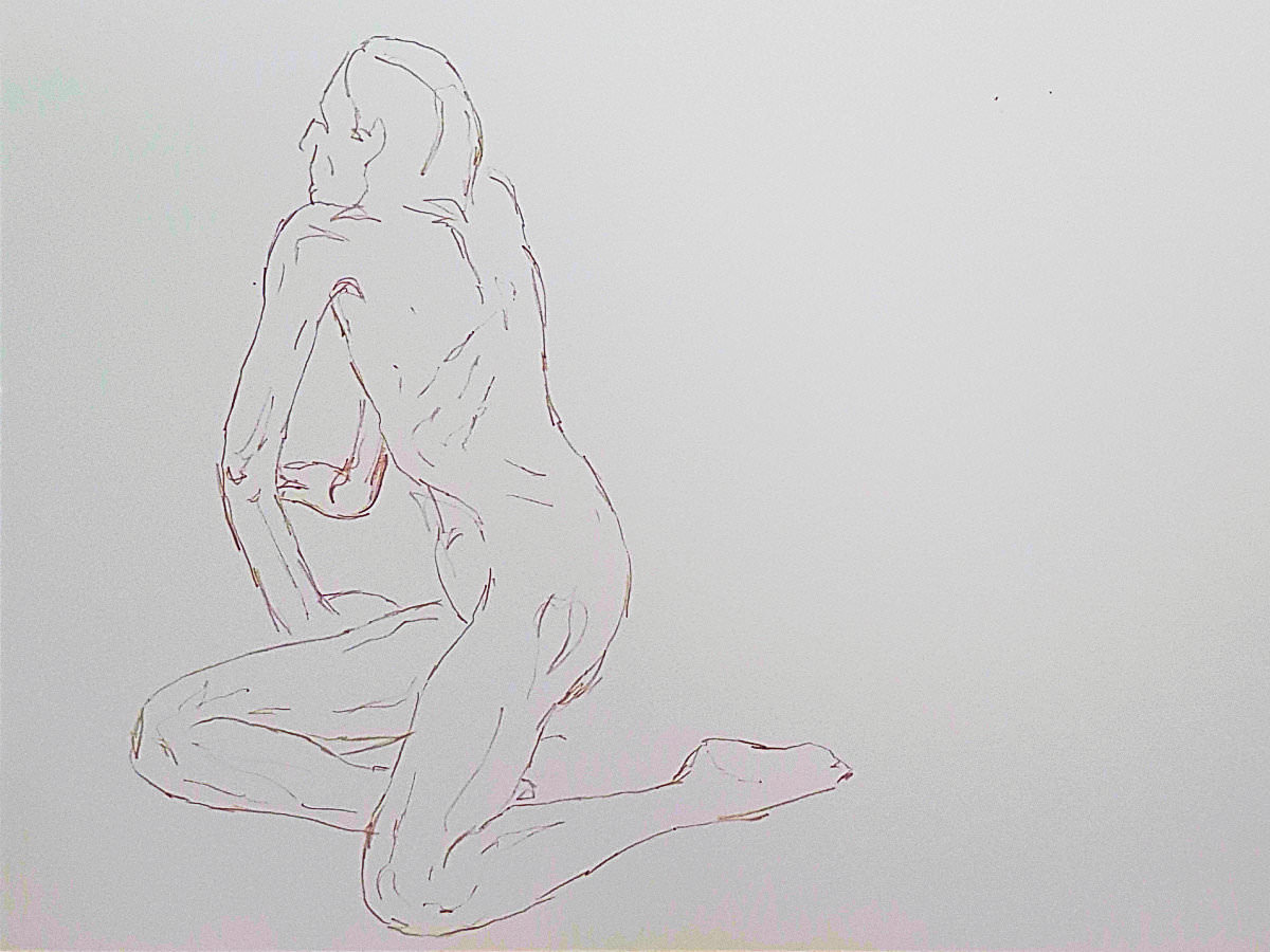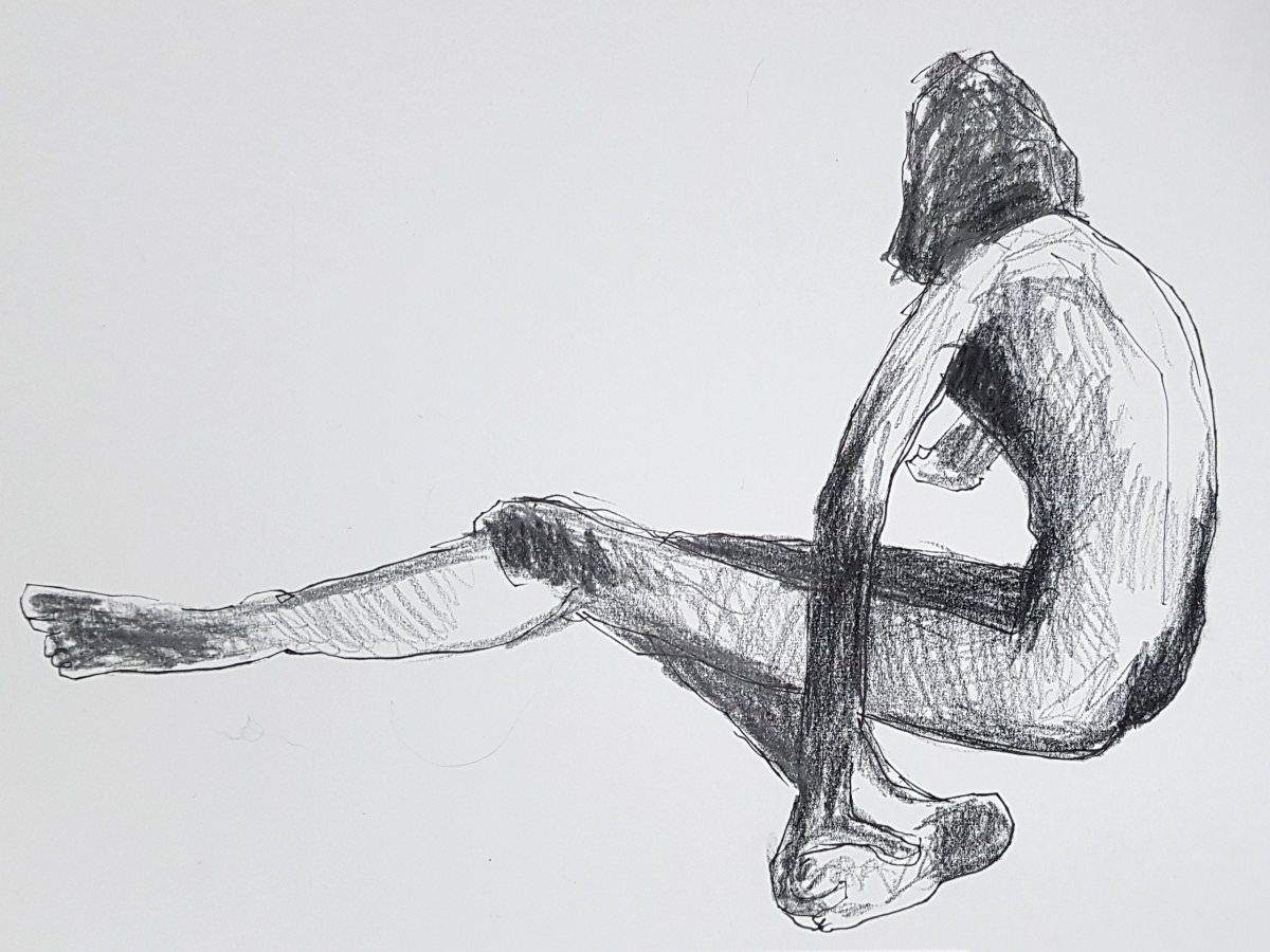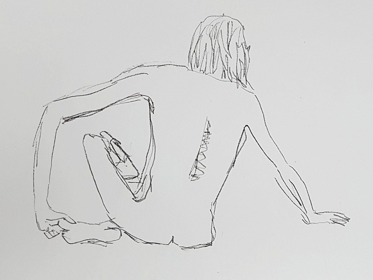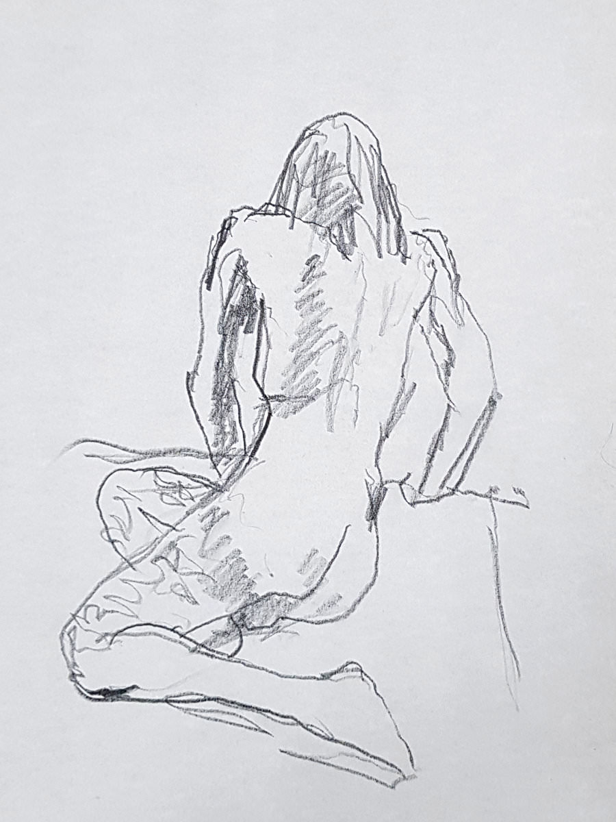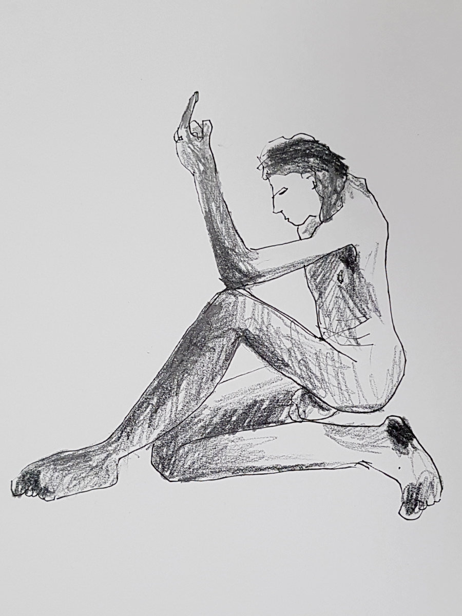 Three longer poses followed: 10 minutes sitting on the floor, 10 minutes upright, then 20 minutes on my backside again, albeit differently angled. Part of the challenge was not only to vary the poses in this session, but also to avoid repeating any I’d used my previous – very recent – visit.