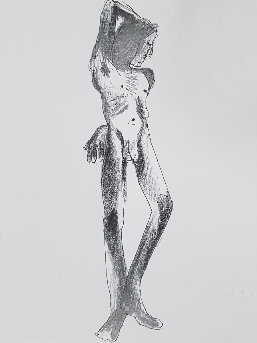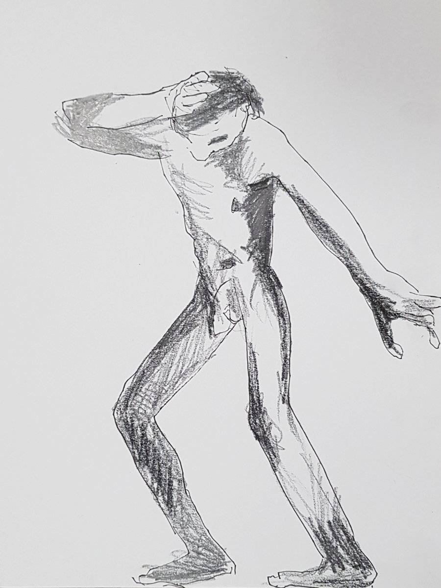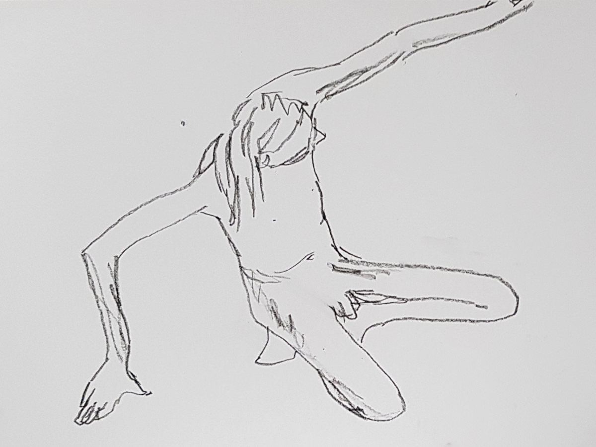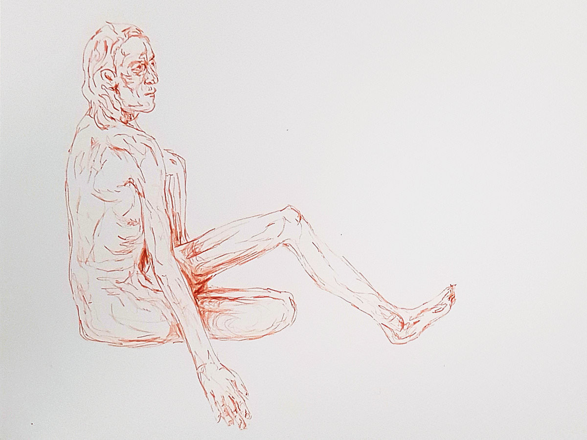 Three longer poses followed: 10 minutes sitting on the floor, 10 minutes upright, then 20 minutes on my backside again, albeit differently angled. Part of the challenge was not only to vary the poses in this session, but also to avoid repeating any I’d used my previous – very recent – visit.