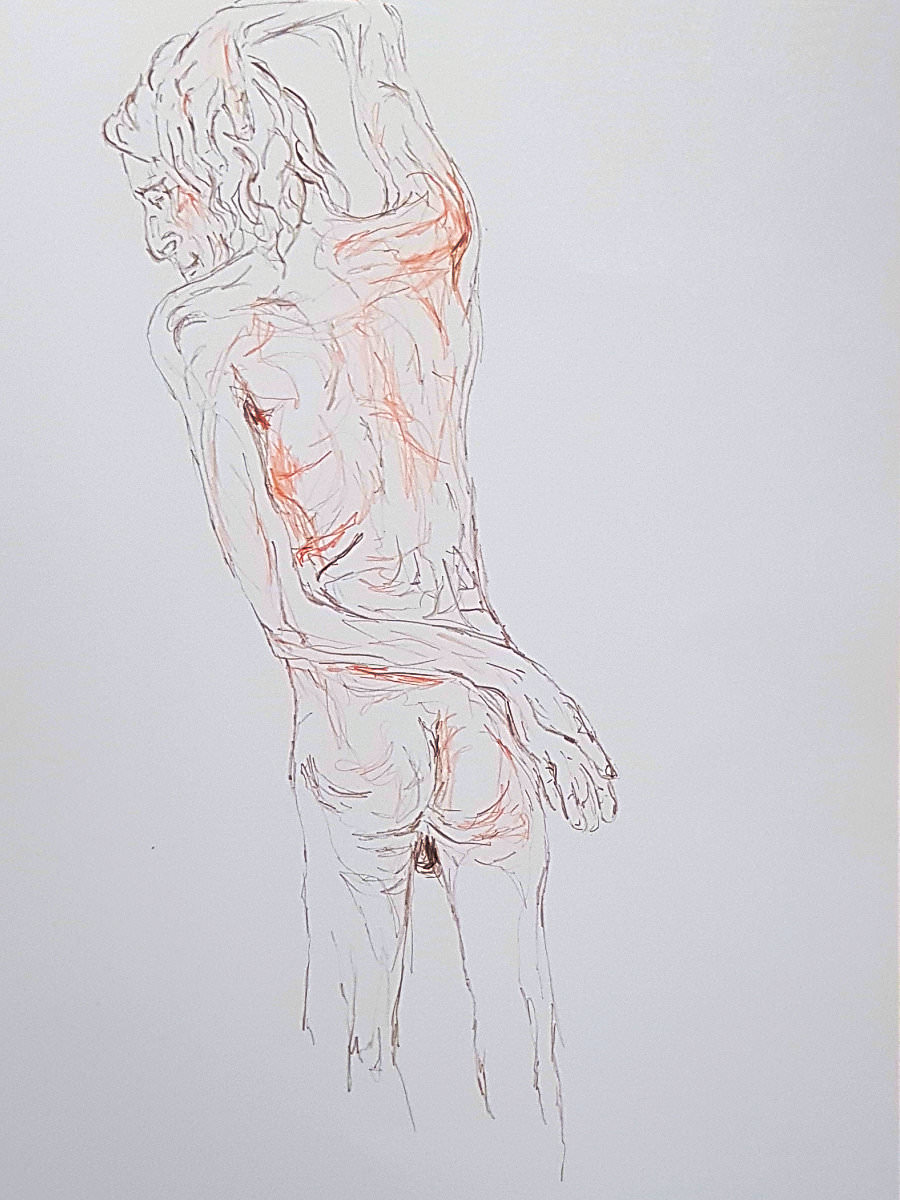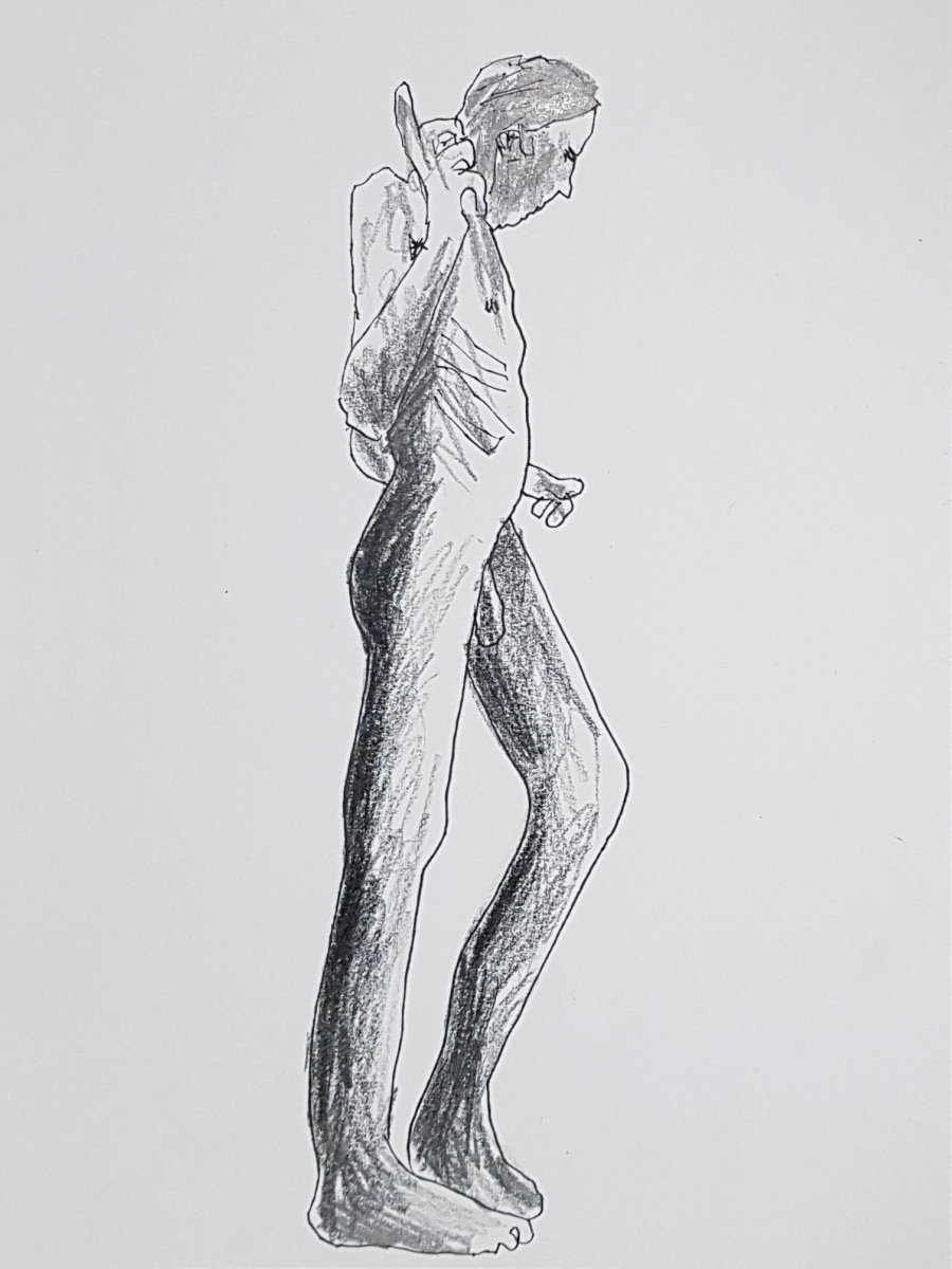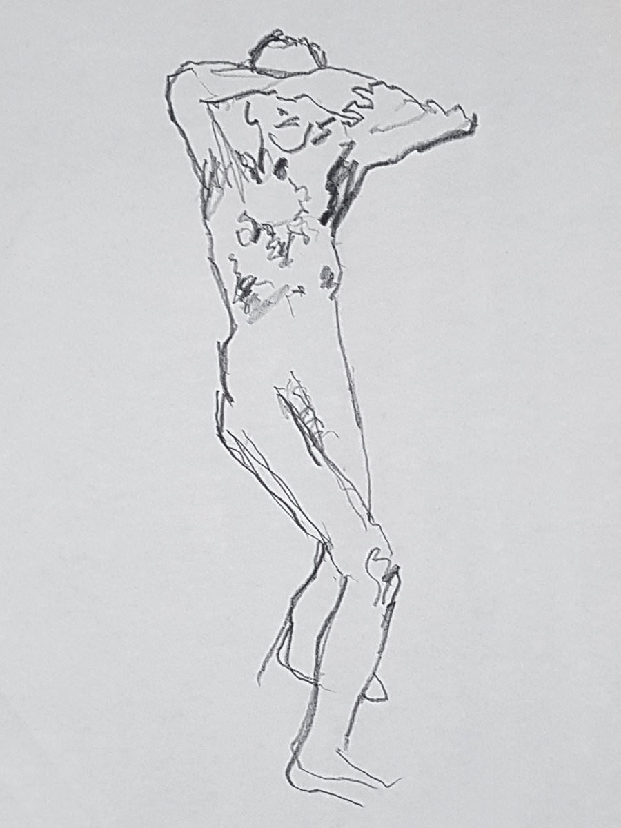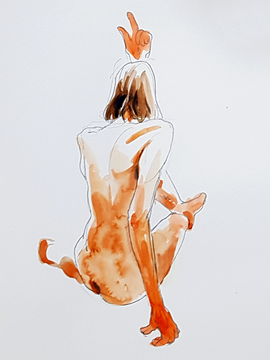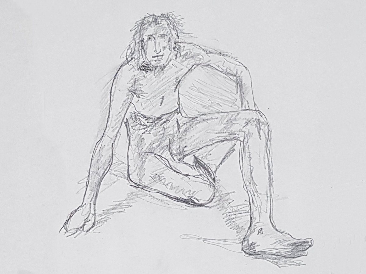 Three longer poses followed: 10 minutes sitting on the floor, 10 minutes upright, then 20 minutes on my backside again, albeit differently angled. Part of the challenge was not only to vary the poses in this session, but also to avoid repeating any I’d used my previous – very recent – visit.