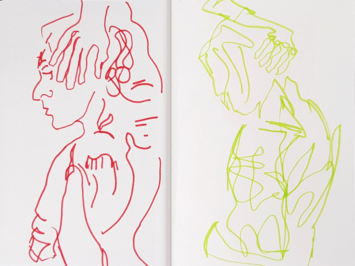 When people say “life goes on” they mean “existence goes on“. For some people life won’t go on; under this government, needlessly, avoidably, tragically it won’t go on. In this session, for this evening at least, we went on: 1-minute, 1, 1, 1, 1, 5, 20, a break, and 50-minutes to the end. Me, tutor Jo (who made these drawings), and 2 students.