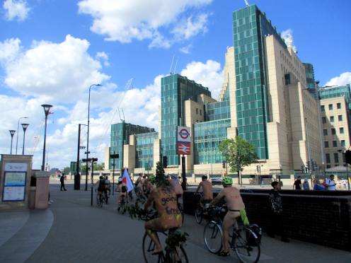 Stockwell and Vauxhall were our last south London districts before the Thames. We passed through on quieter roads: Clapham Road, South Lambeth Road, Parry Street and Wandsworth Road. After two and a quarter hours’ naked bike riding, the Croydon crew finally reached the river… at MI6, which had probably monitored us all the way.