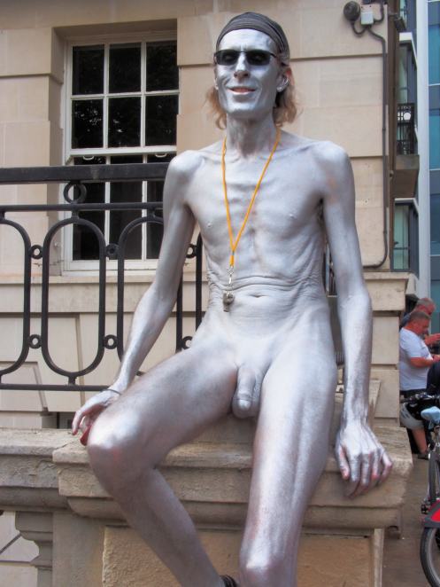When I entered the vast secluded grounds, I found naked people in various stages of preparedness. Some were body painted, one was a work in progress, others awaited their turn. And me? I found a private corner of garden, undressed, opened my tube of Kryolan liquid brightness, and made myself… well… more noticeable.
