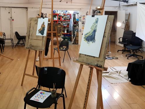 This return to Arts Theatre for City Academy came so soon after my previous visit that I found paintings of me in oil, still hanging up to dry. Those were clothed portraits whereas this would be session 3 of 5 in a Painting the Figure course. When I arrived, tutor Lawrence F Crane was busily preparing the ‘Pigeon Loft’ studio space.
