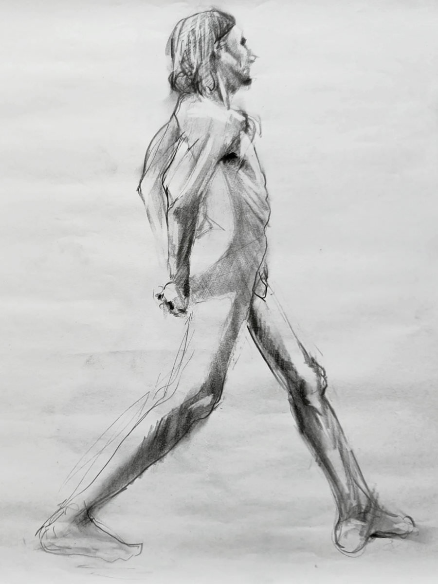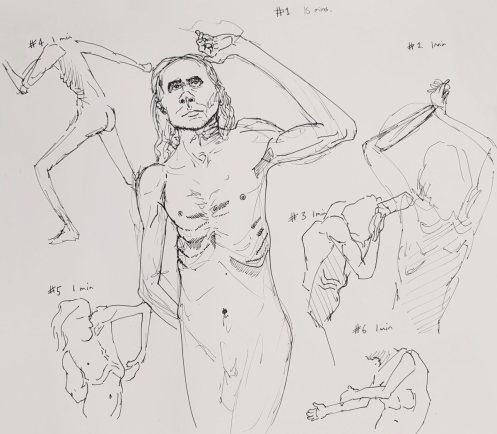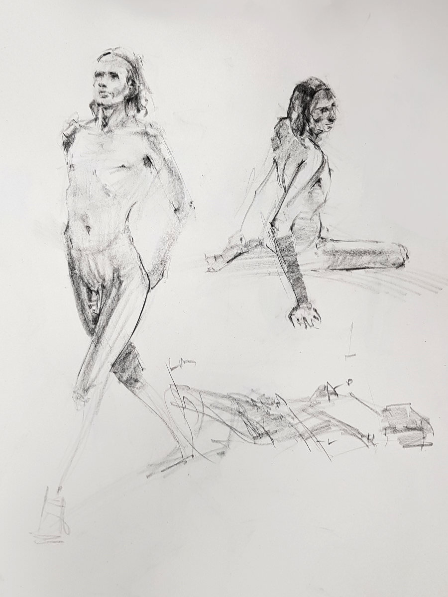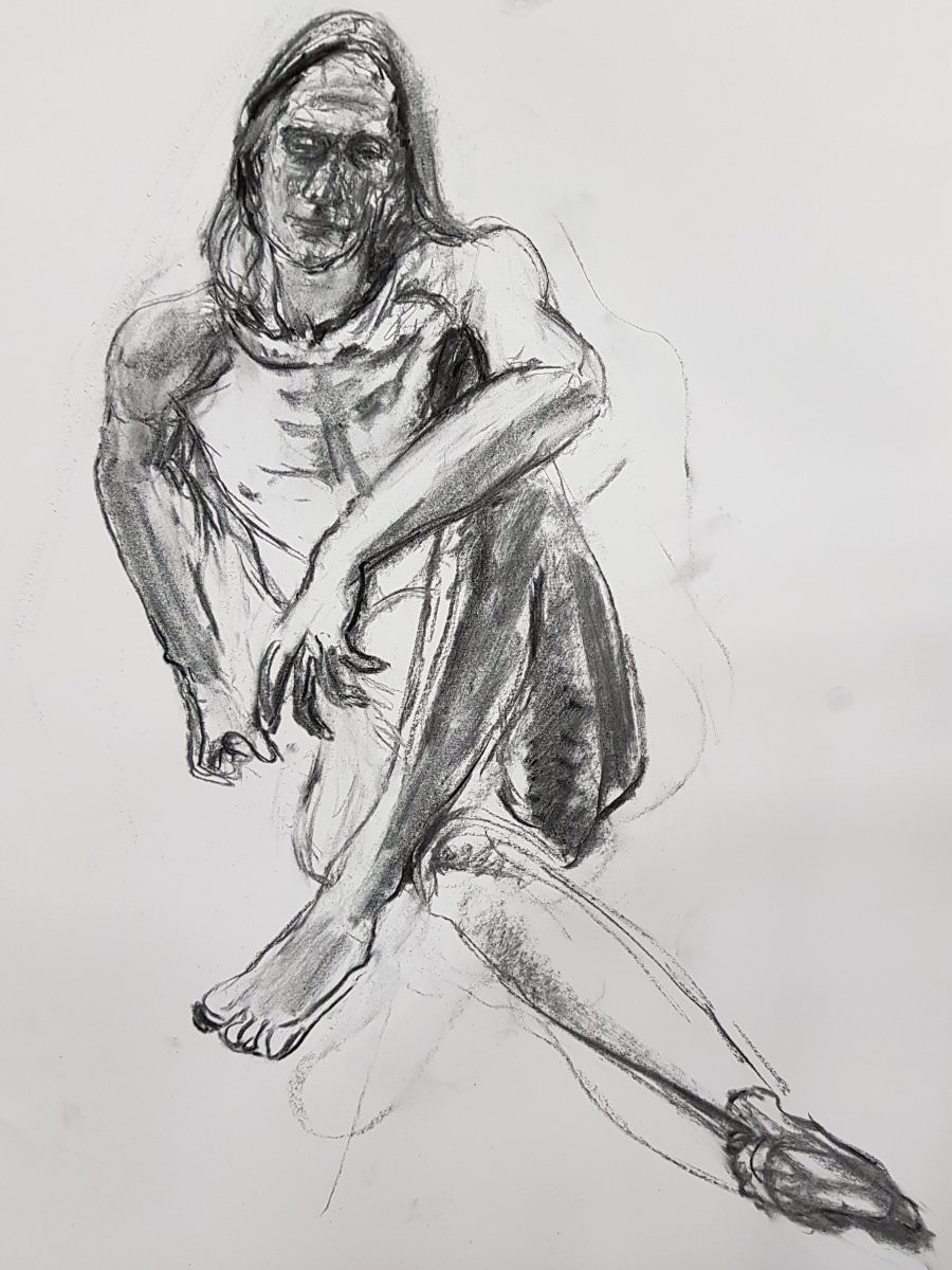 I arrived on time to find the room crammed with artists, and still more coming through the door. It meant we started late but this was fine as it allowed me to settle mentally. To compensate, the first 15-minute pose seemed to last just 12. Five 1-minute poses followed, then a 5-minute pose, and then a 10-minute pose that overran to 12.