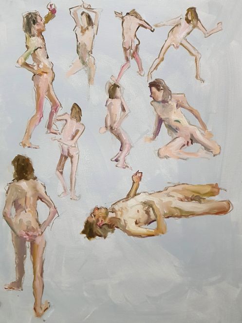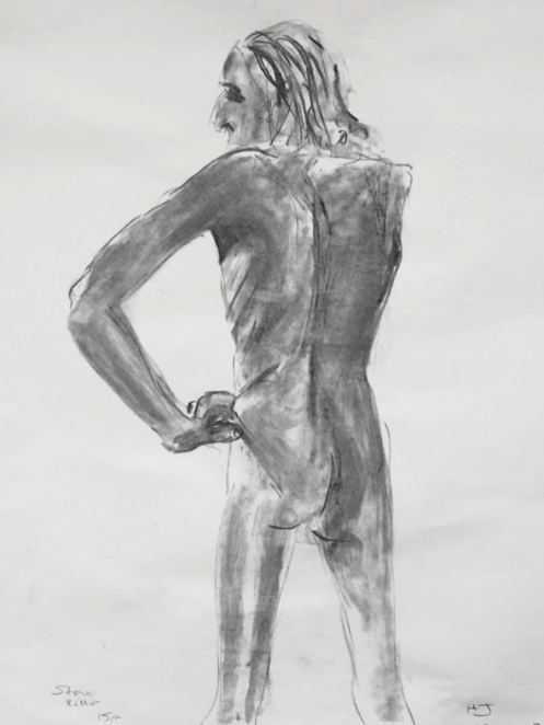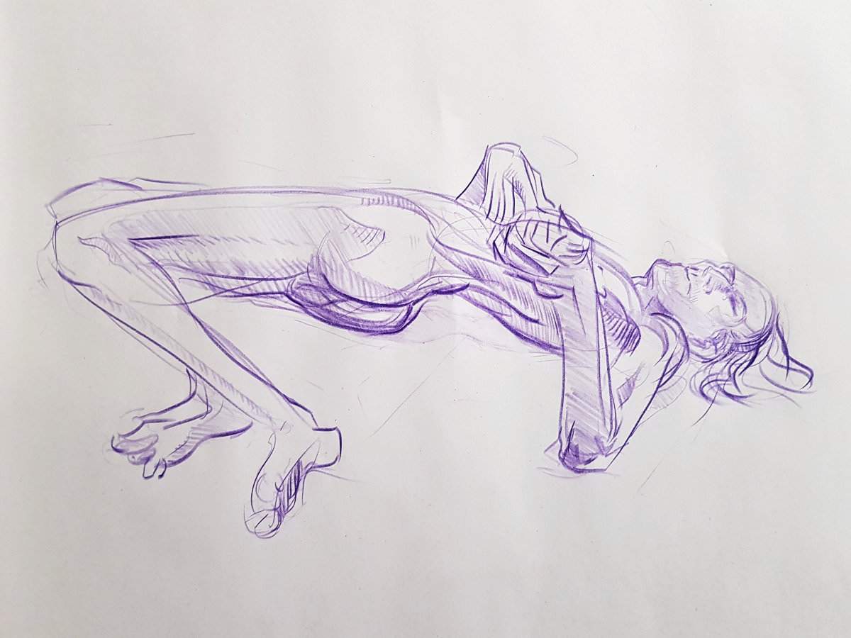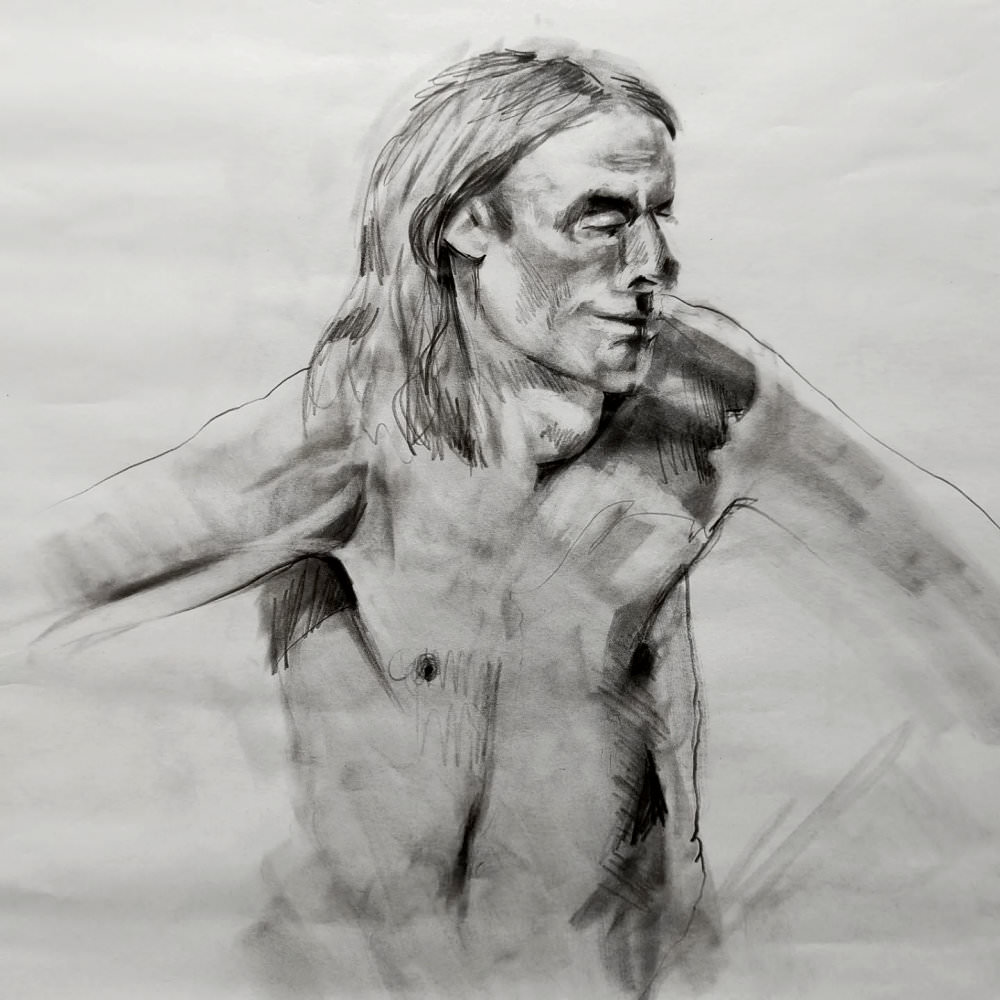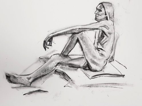 By the time this penultimate pose was called to a halt we had 22 minutes left until our scheduled 9pm finish. Thus the final pose lasted 22 minutes. Working in the round all evening, I’d been alternating direction with each change and now did so one last time. Hopefully I managed to provide a pretty fair balance of views from all perspectives.