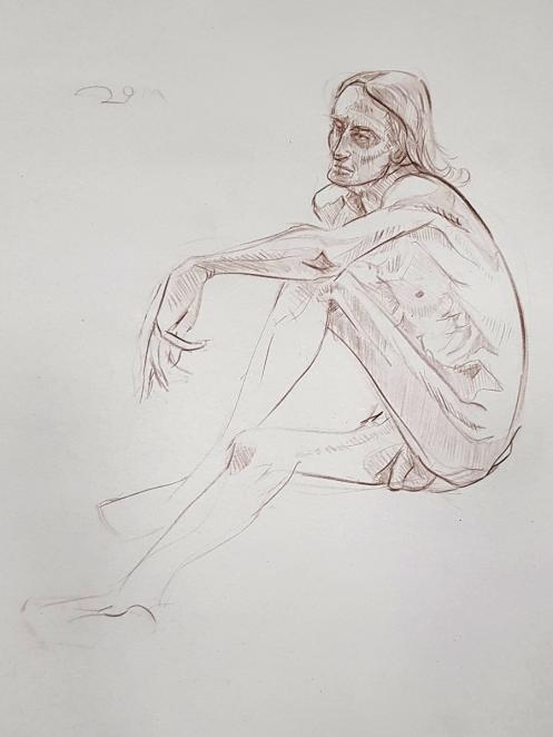 It had been a pretty comfortable first half. When Adrian brought it to a close and gave the artists a run-down of catering and group admin details, I slipped into my robe and out the door to get a mugful of dhal, some crisps, and a jellybaby for dessert. After an extended break, we resumed with a pose of 10-15 minutes.