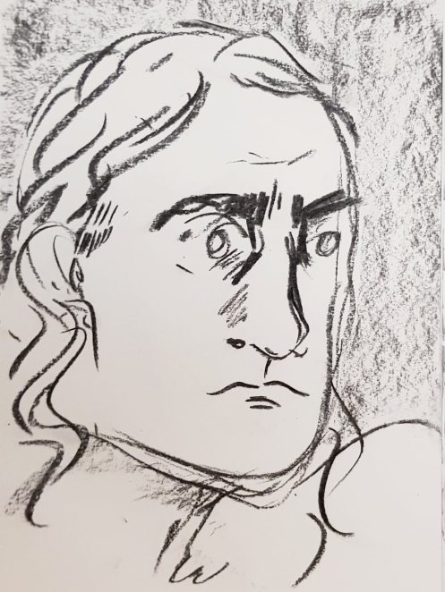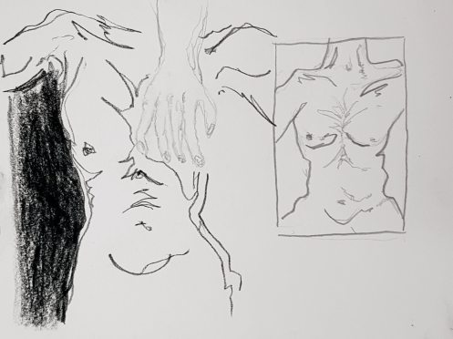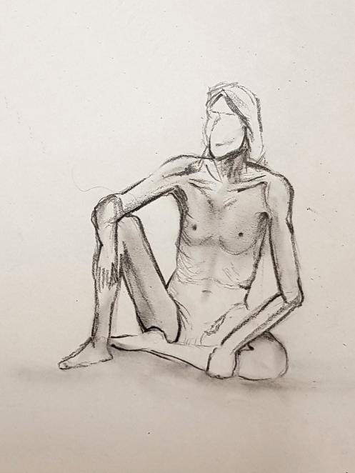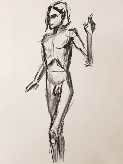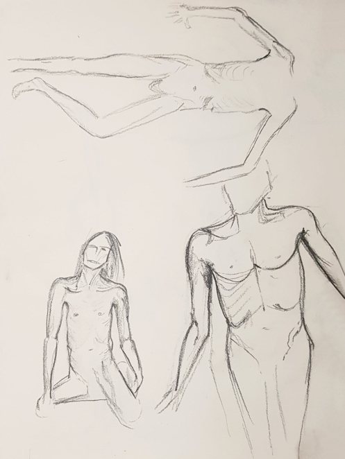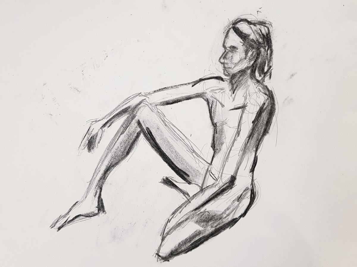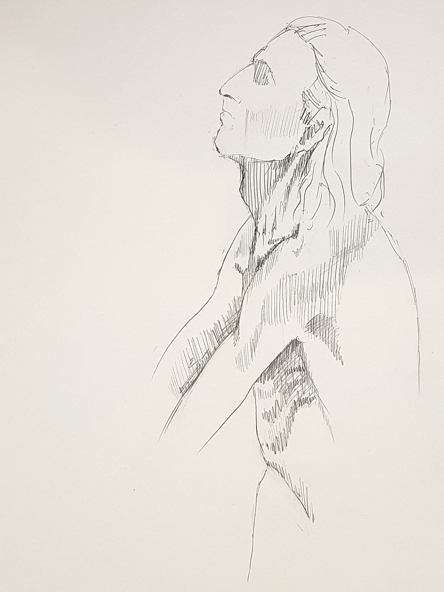 A quick half-time glance at artworks created thus far revealed what I presumed would be the case: my proximity to the artists in such an intimate space meant very few had captured my full head-to-toe figure, especially when standing. This needed rectifying, so after the interval I decided to stick with only compact seated poses.
