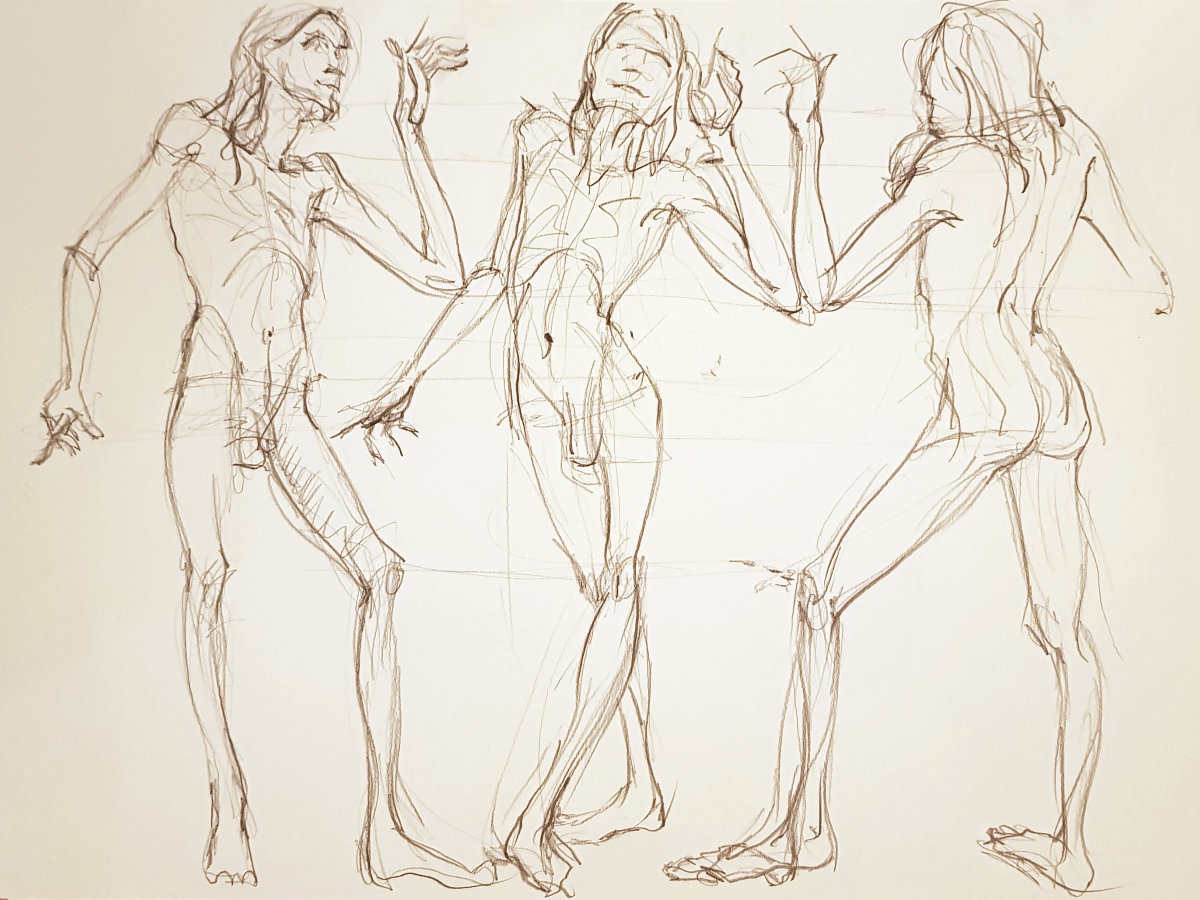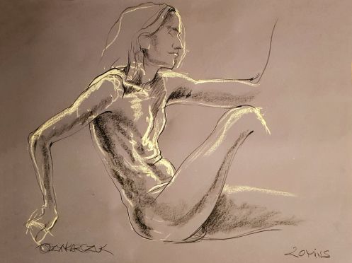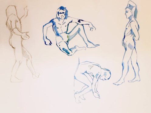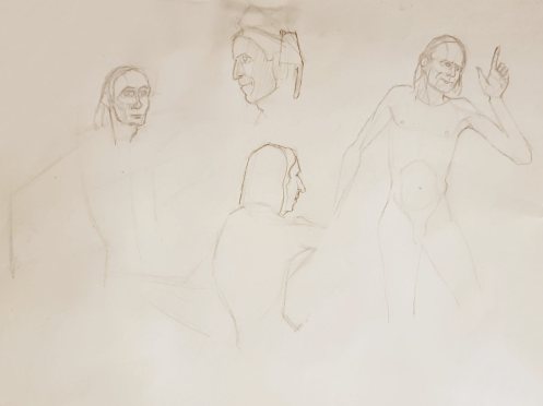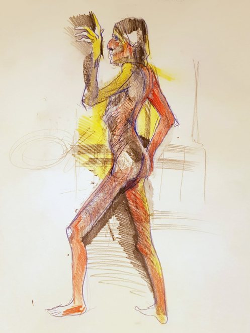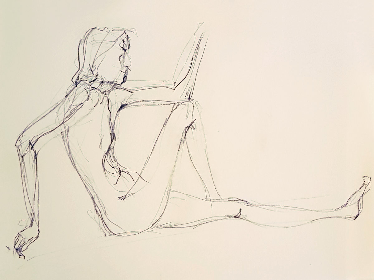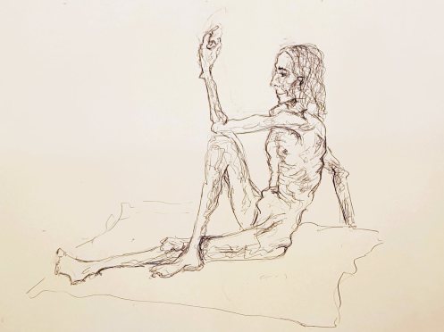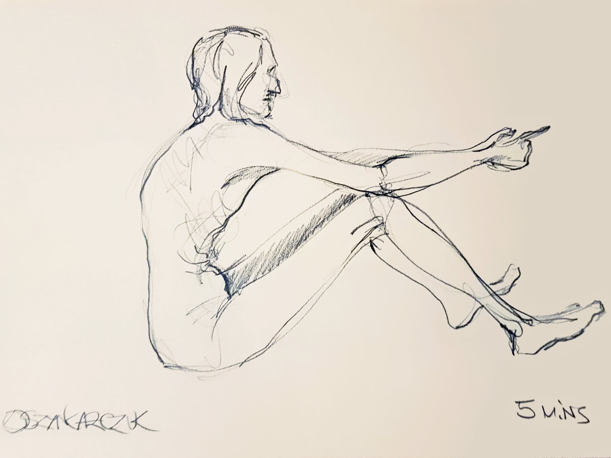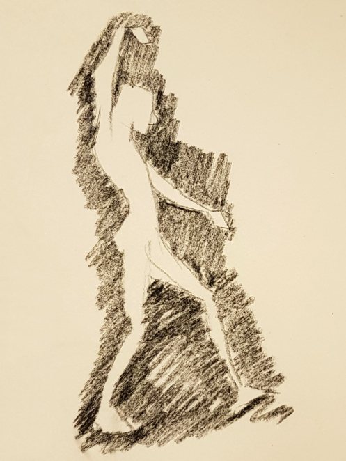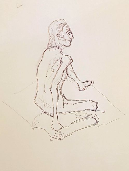 On the plus side, so many artists turned up to draw that it felt as though I was posing for two evening’s worth of people in one go. We started with quick stuff, five 2-minute poses, followed by three 5-minute poses: standing, kneeling, standing, standing, and standing; then sitting, standing, sitting again. It hardly sounds inspiring seems when I write it like that, but do allow for varying rotations, contortions, twists and angles.