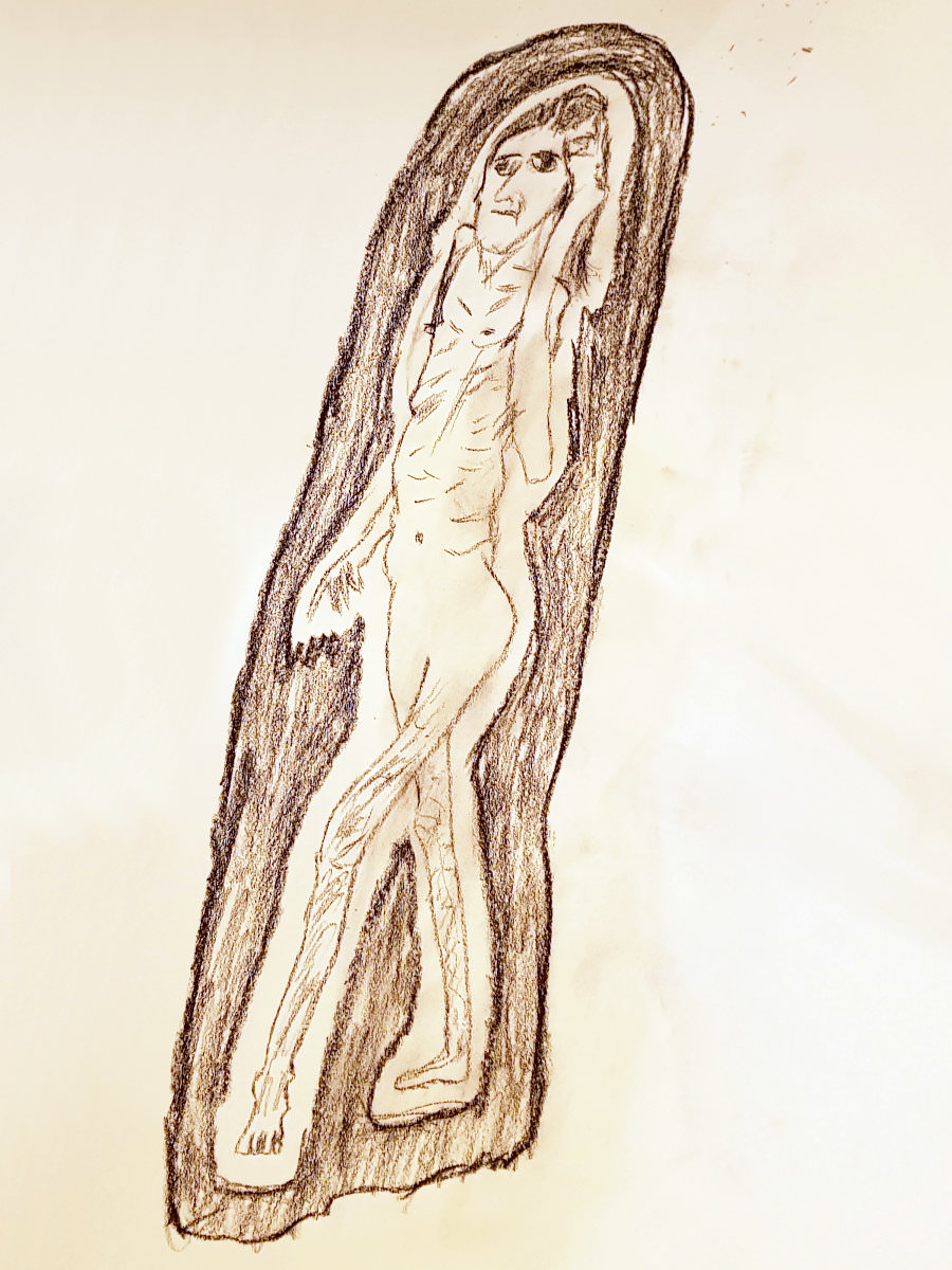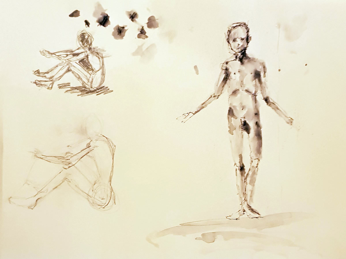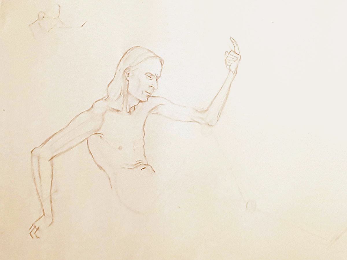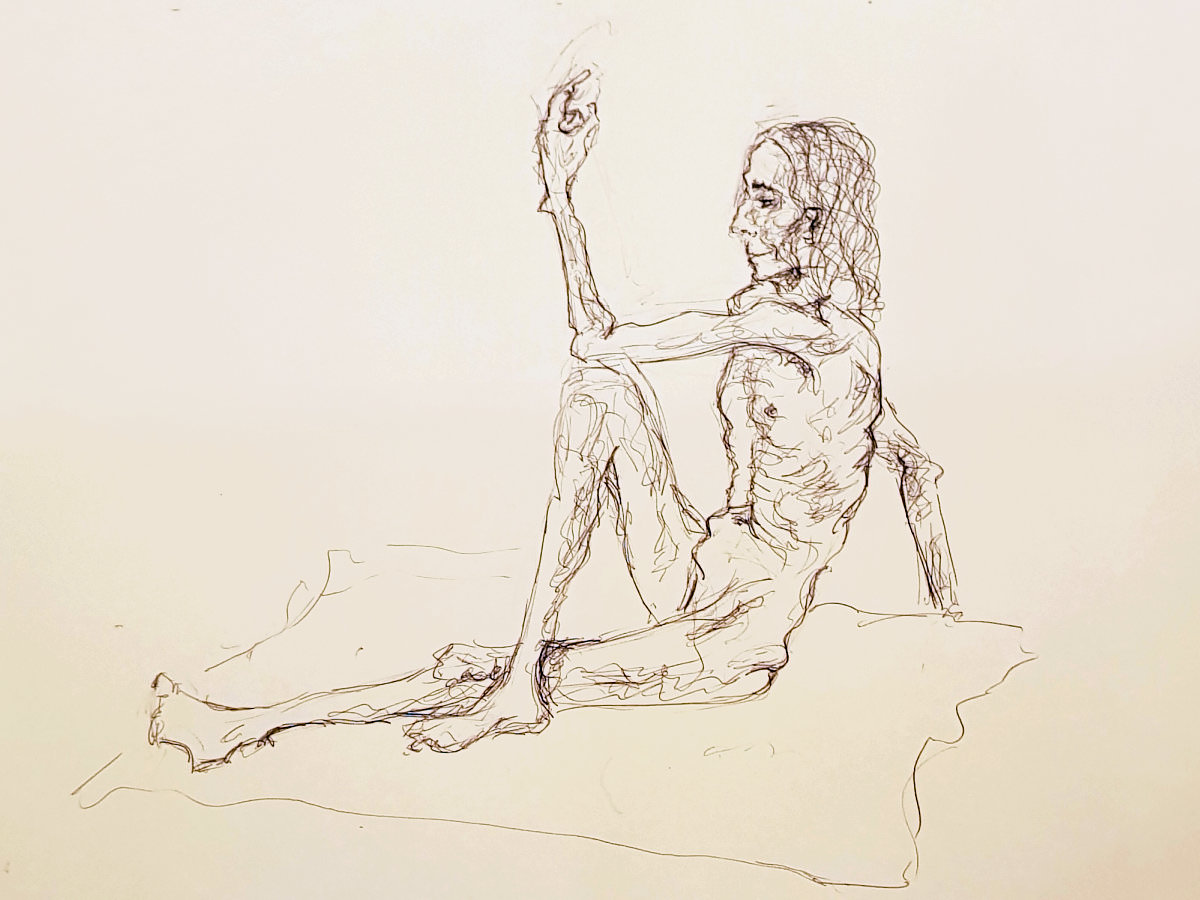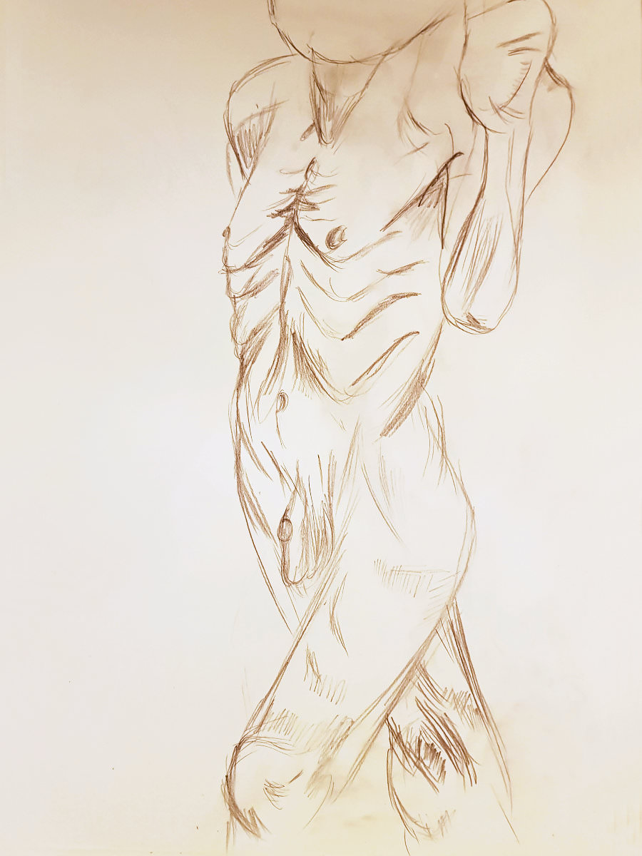 On the plus side, so many artists turned up to draw that it felt as though I was posing for two evening’s worth of people in one go. We started with quick stuff, five 2-minute poses, followed by three 5-minute poses: standing, kneeling, standing, standing, and standing; then sitting, standing, sitting again. It hardly sounds inspiring seems when I write it like that, but do allow for varying rotations, contortions, twists and angles.