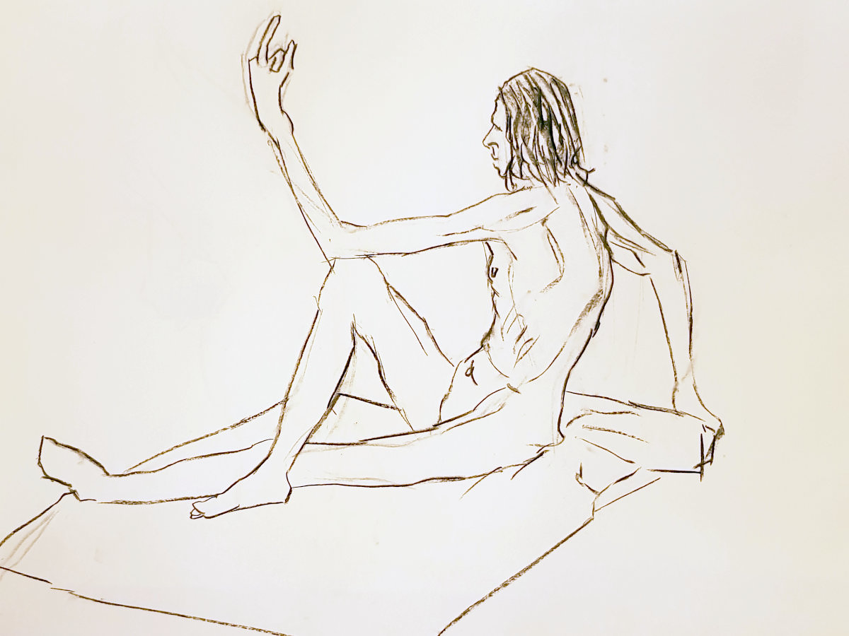 After a break for drinks and socialising, artists were given a choice: would they prefer one pose of 45 minutes or two poses of 25 and 20 minutes? It seemed only a third of the group felt sufficiently impassioned to take part in the show of hands, but the clear preference was two poses. For the first, I stood with both hands outstretched at waist level; for the second, I sat with left leg outstretched, right crossing over, left arm up
