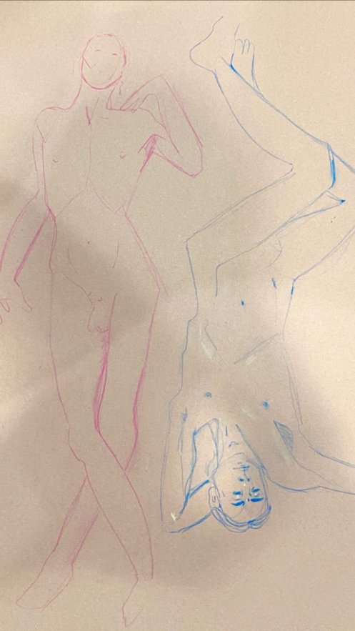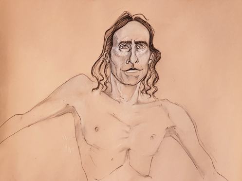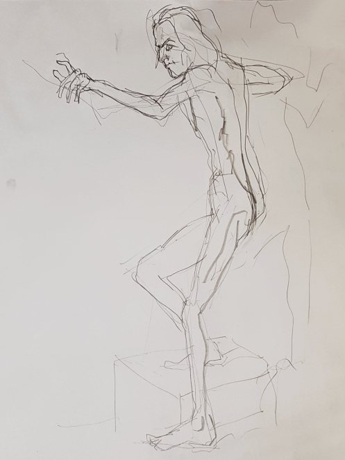 This was my first life model booking of 2023 – indeed my first in over 6 weeks – and I confess I misjudged. Inspired by a fleeting stance I’d observed during a performance of ‘One Man Poe‘ by Stephen Smith at King’s Head Theatre the night before, I set my opening 10-minute pose: upright, leaning back upon a wall with my right forearm whilst twisting left and reaching out to point with my left hand…