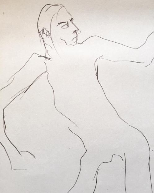 Only 10 minutes. Rock solid for the first three or four at least. After that, I don’t recall whether mental doubts or physical tremors made the first insidious intervention. Soft, soft, soft, the tremors came; my right arm yearning to slip along the wall, my left arm willing to dip, my torso taxed of resolve. Only 10 minutes. Then the artists graciously acknowledged my struggle… and we moved on to the next 10 poses.