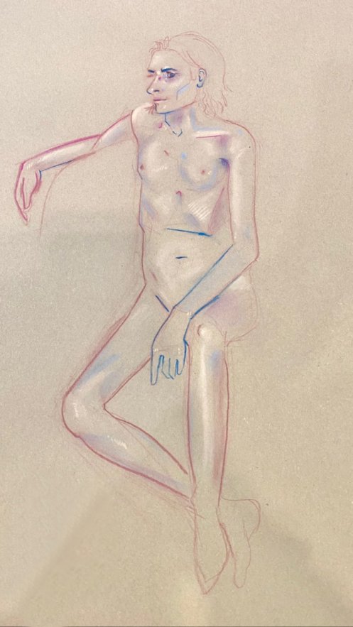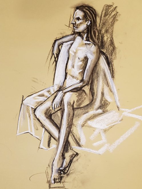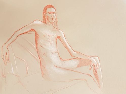 Notwithstanding my early discomfort, I thoroughly enjoyed this return to modelling. It had been a pleasant surprise to be booked for South East London Life Drawing at The Art of Isolation so soon after my last visit in November 2022. There’s a lovely feeling of easy-going appreciation and enthusiasm from the artists that can’t help but encourage a model to give their best. Quite a few familiar friendly faces here too.