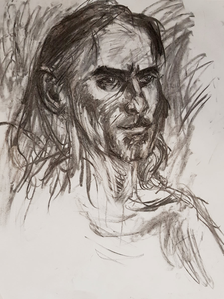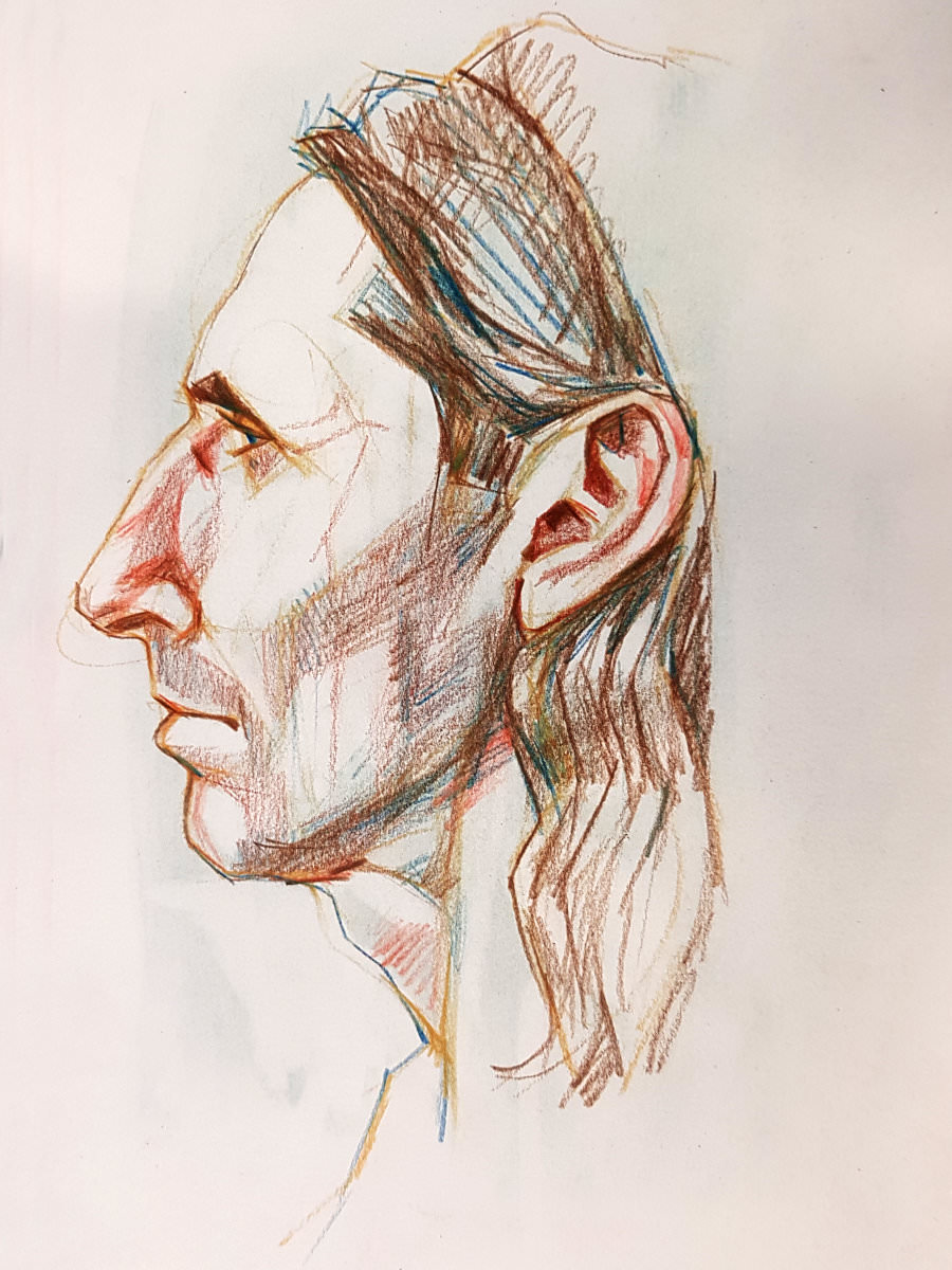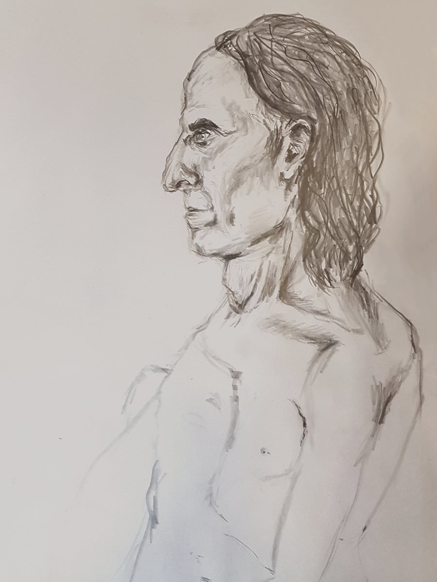 Shorter poses followed: three of 1 minute, three of 2 minutes, one each of 3 minutes, 5 minutes and 8 minutes. I set about these with vigour, variety and a great deal more self-awareness and common sense. Poses can venture to a threshold of pain but are not obliged to cross it. We concluded the session with a 1-hour pose; 15 minutes to a tea break, and a further 45 minutes to the end.