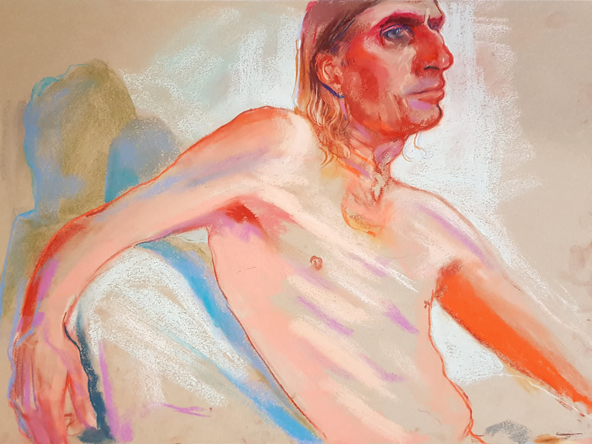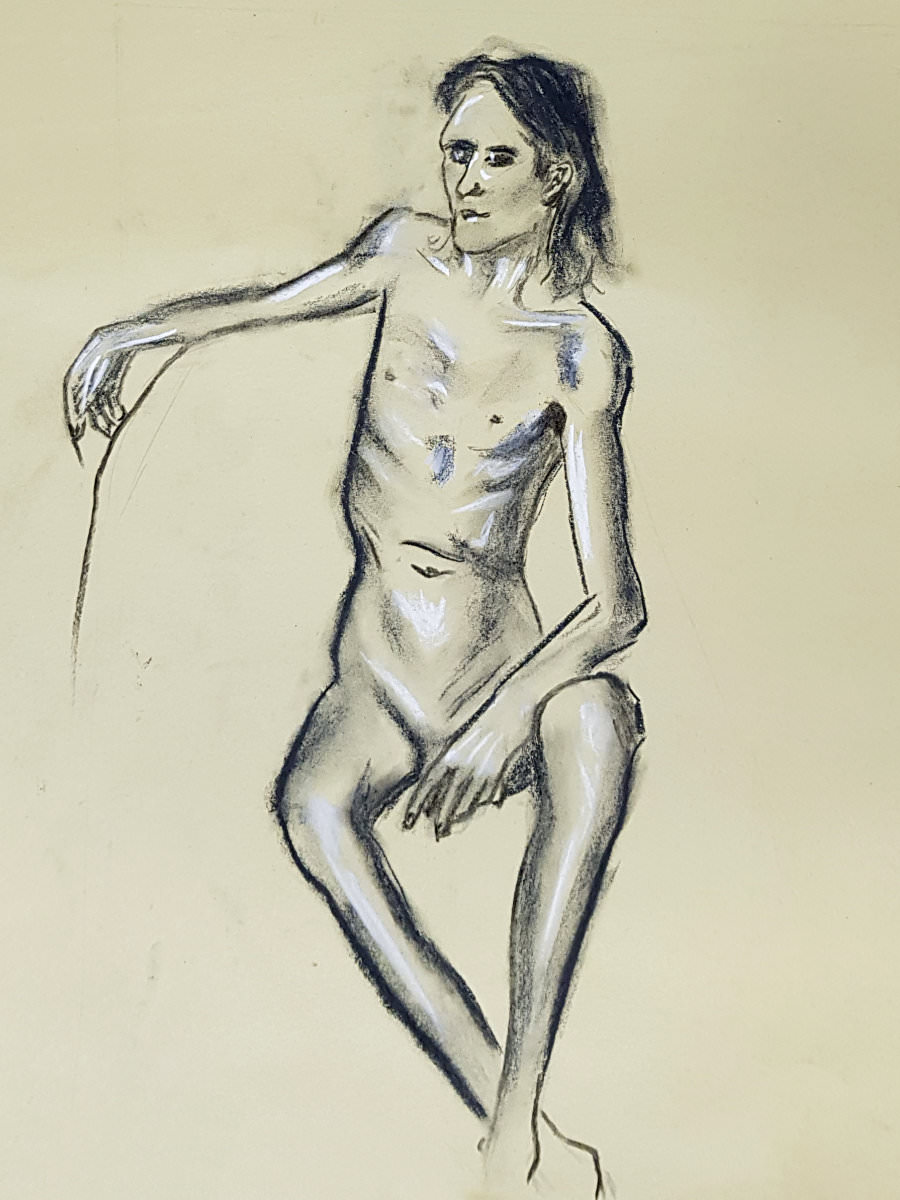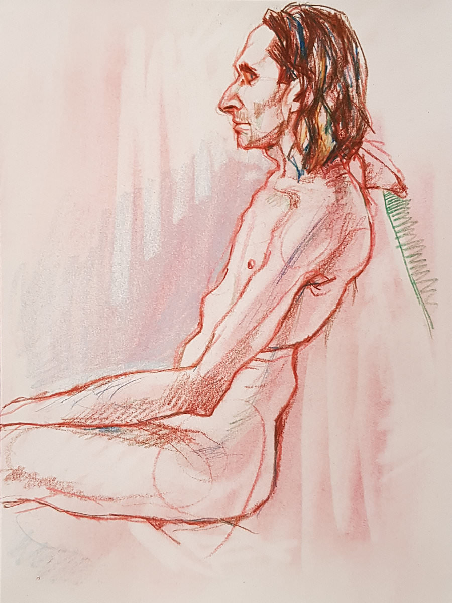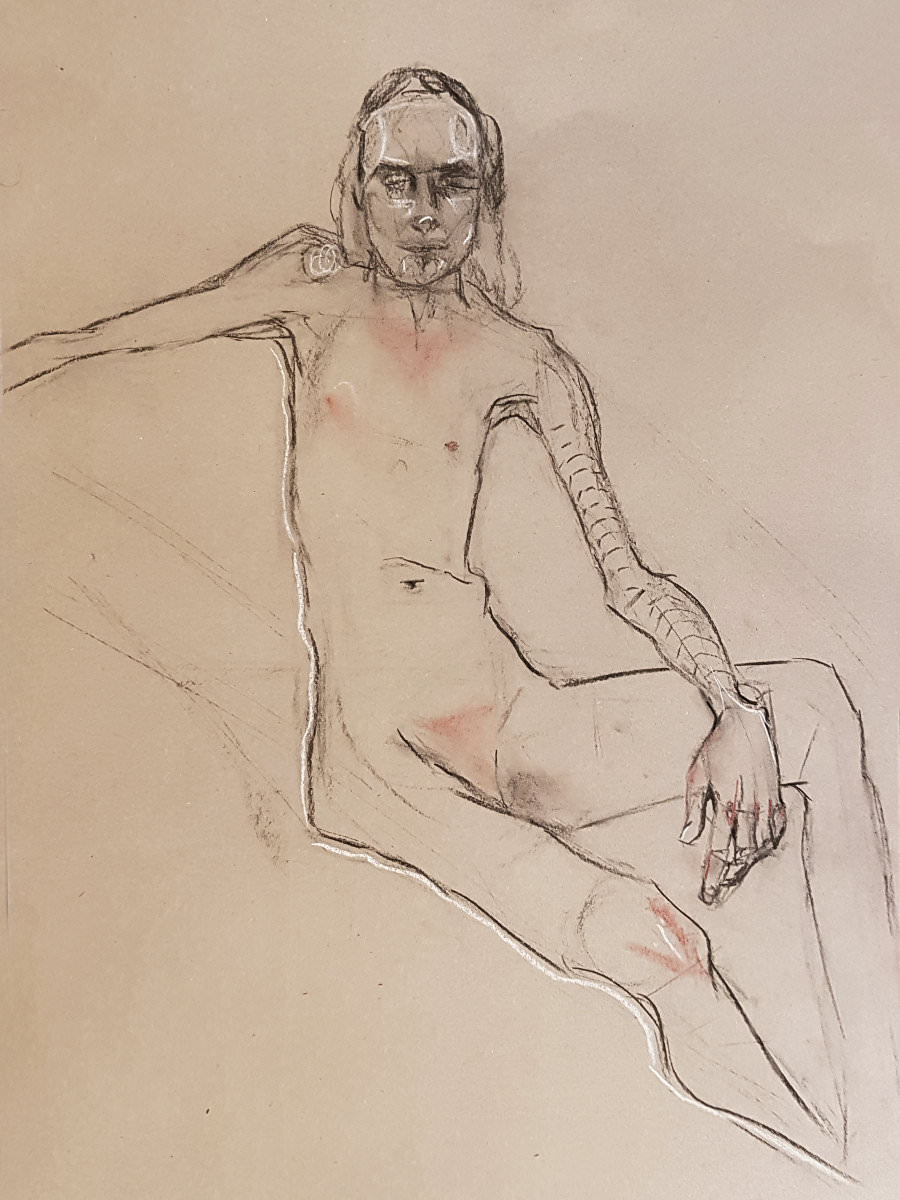 Notwithstanding my early discomfort, I thoroughly enjoyed this return to modelling. It had been a pleasant surprise to be booked for South East London Life Drawing at The Art of Isolation so soon after my last visit in November 2022. There’s a lovely feeling of easy-going appreciation and enthusiasm from the artists that can’t help but encourage a model to give their best. Quite a few familiar friendly faces here too.