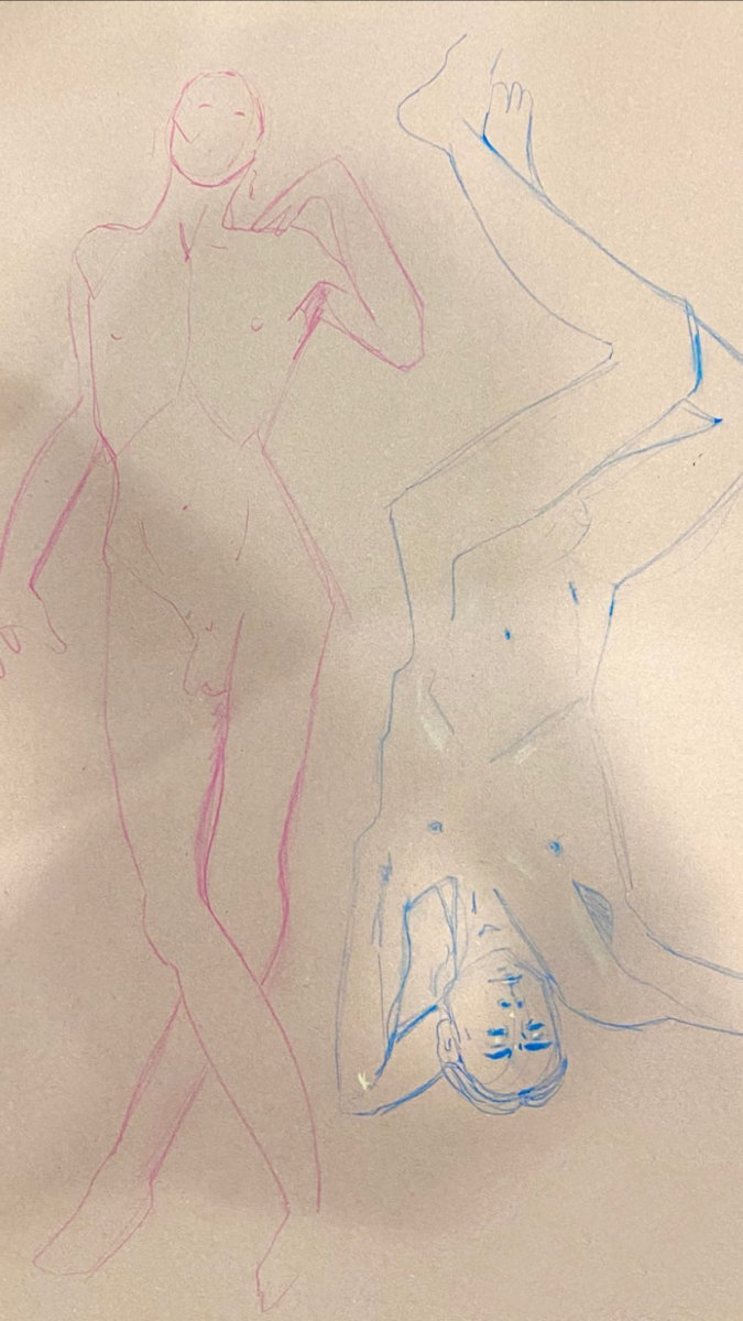 This was my first life model booking of 2023 – indeed my first in over 6 weeks – and I confess I misjudged. Inspired by a fleeting stance I’d observed during a performance of ‘One Man Poe‘ by Stephen Smith at King’s Head Theatre the night before, I set my opening 10-minute pose: upright, leaning back upon a wall with my right forearm whilst twisting left and reaching out to point with my left hand…