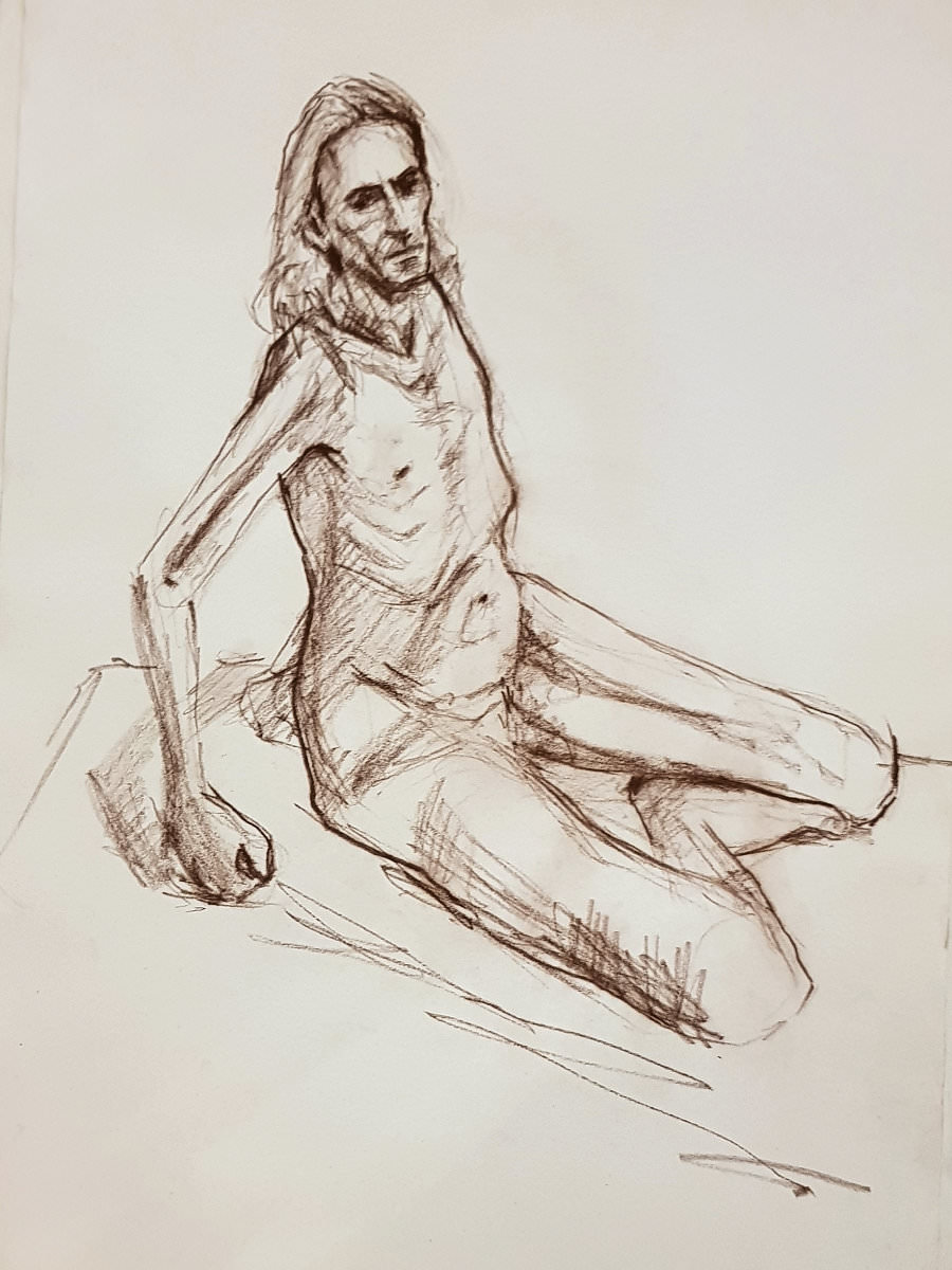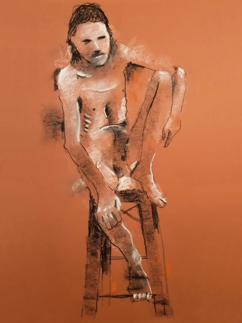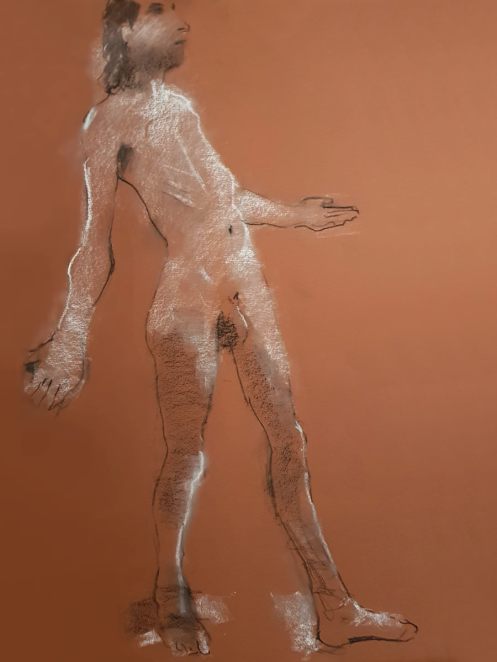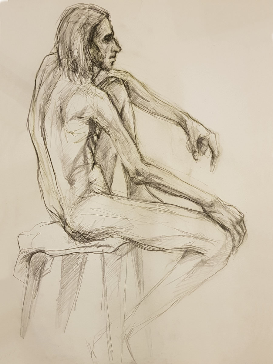 The plan was to finish with one 45-minute pose. This left artists with just 8 minutes to fetch drinks from the bar, pop to the loo and prepare for the second half. Meanwhile, I took a leisurely stroll around the art space to appreciate artworks already made. With our restart imminent I moved a high stool to the centre of the room and perched upon it in as angular a fashion as seemed sustainable for the time remaining.