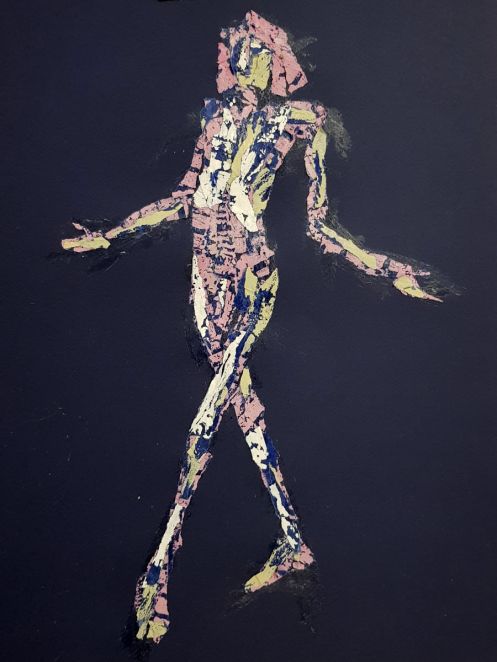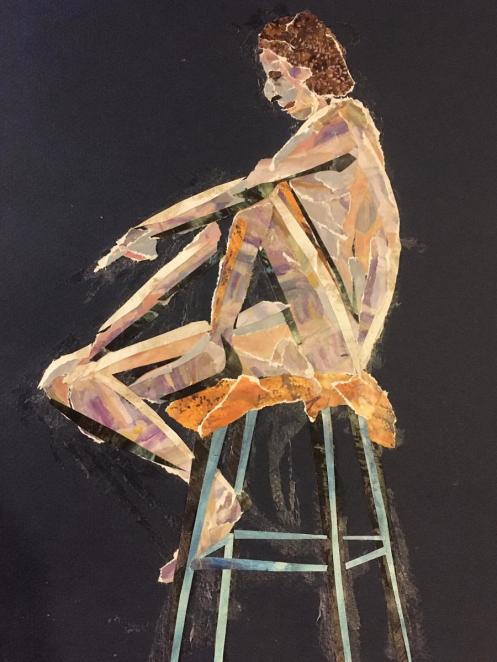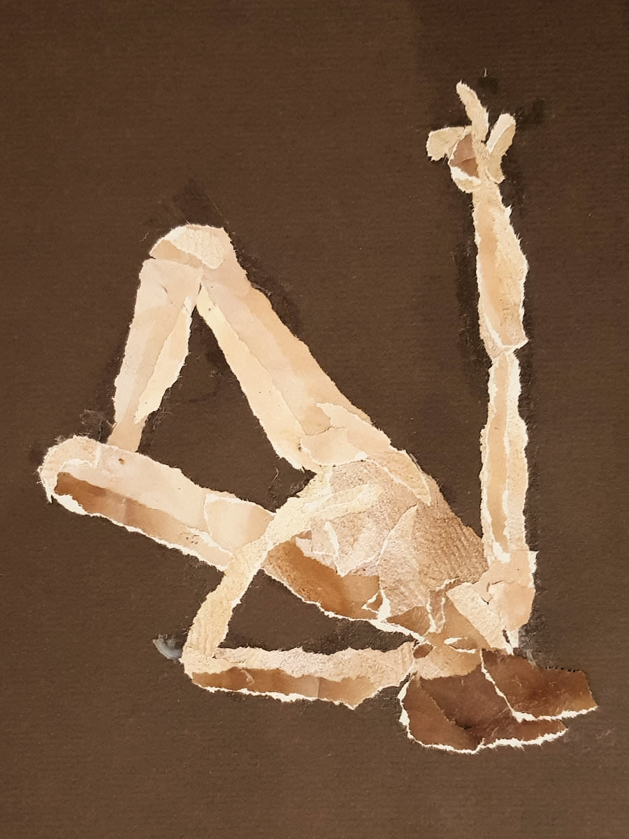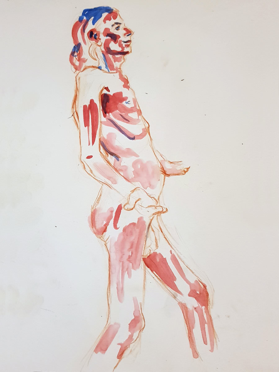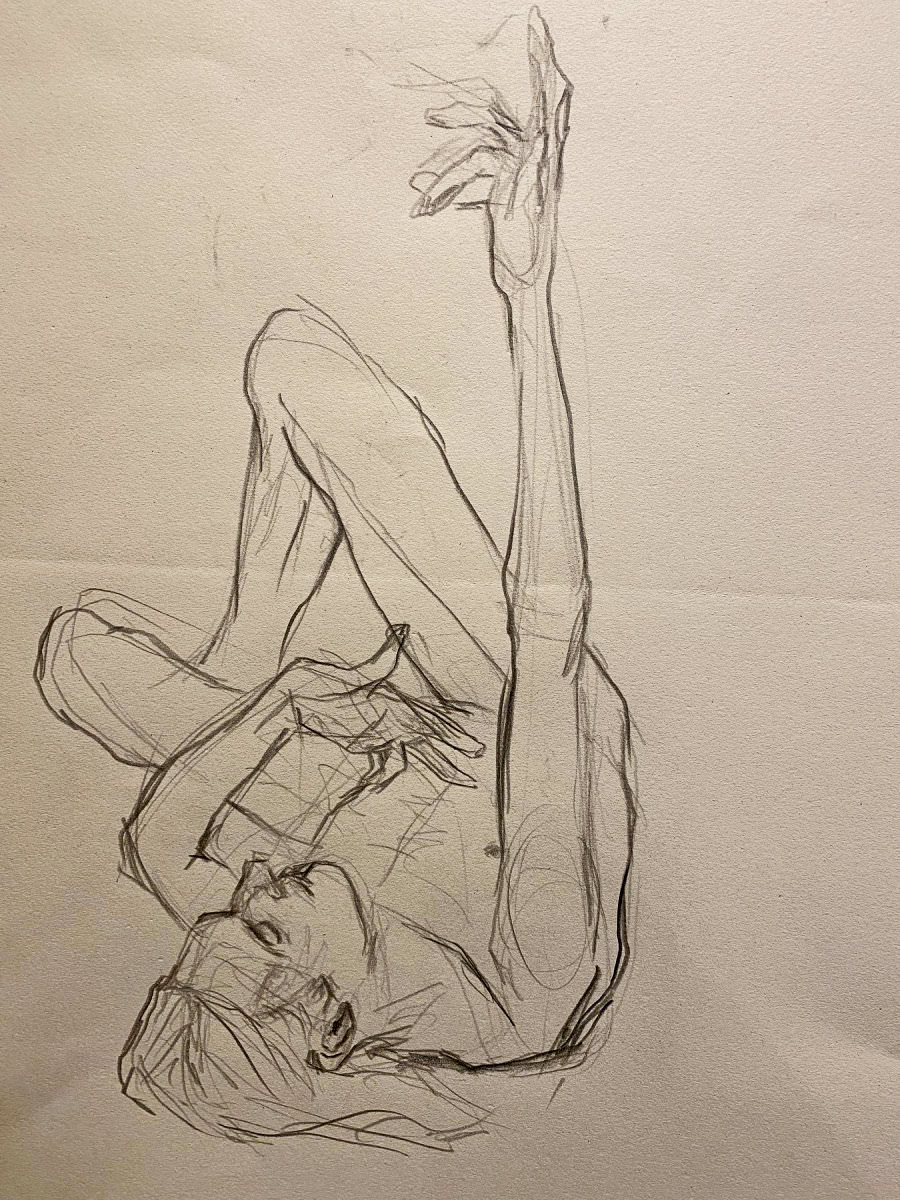 The plan was to finish with one 45-minute pose. This left artists with just 8 minutes to fetch drinks from the bar, pop to the loo and prepare for the second half. Meanwhile, I took a leisurely stroll around the art space to appreciate artworks already made. With our restart imminent I moved a high stool to the centre of the room and perched upon it in as angular a fashion as seemed sustainable for the time remaining.