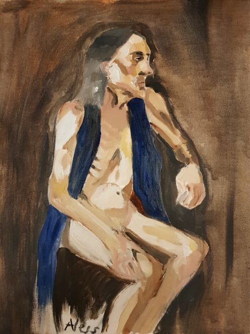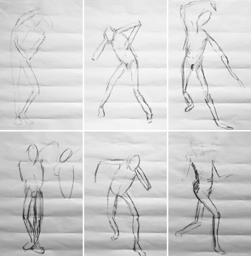 I would be posing for three different courses – ‘Painting the Figure’, ‘Portrait Drawing’ and ‘Portrait Painting’ – led by three different tutors, all of whom I’d worked with in the past. This evening’s ‘Painting the Figure’ session was led by Lawrence F Crane. We started with warm-up drawings: six poses of 2 minutes each.