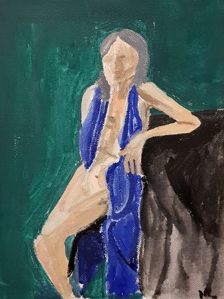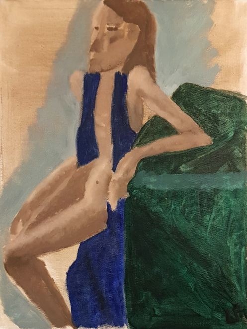 For the remainder of our two-and-a-half hours I sat in a single pose based loosely on the 1923 painting ‘Portrait of Olga Picasso‘ by Pablo Picasso. My white sheet was beneath me, blue fabric round my neck, black velvet across the adjacent table, and a red vase beside me. Six artists at easels. We began.