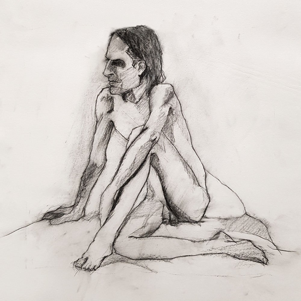 Quick poses to begin: three of 1-minute, which I timed for the class by counting in my head “30, 30, 29, 29, 28, 28…“, then 5 and 10 minutes timed by tutor Victoria Rance shrewdly using a clock. One long pose would follow. Arriving at The Conservatoire, I had agreed to stand for the long pose so I sat for the 5 and 10 minutes. I think I must have sat well, however, as the plan was changed and I sat for the long pose too.