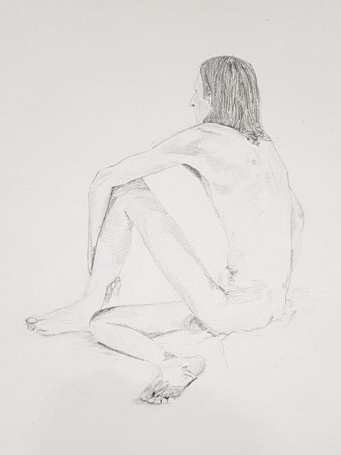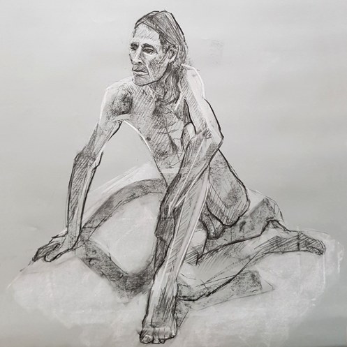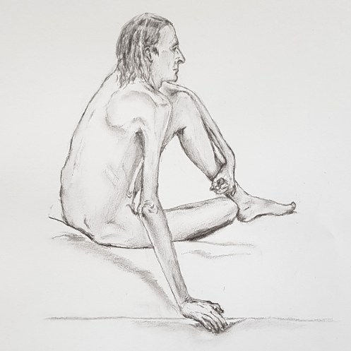 I’ve probably said before but it’s worth saying again: on a long pose, make the period before the first break last as long as possible. The reason? We relax when creating a new pose, but we must tense our muscles to recreate it – it’s not possible to relax the same way twice. I had one more arm-stretch before the session reached its end. And then: the artworks… such wonderful drawings! A particularly rewarding session.