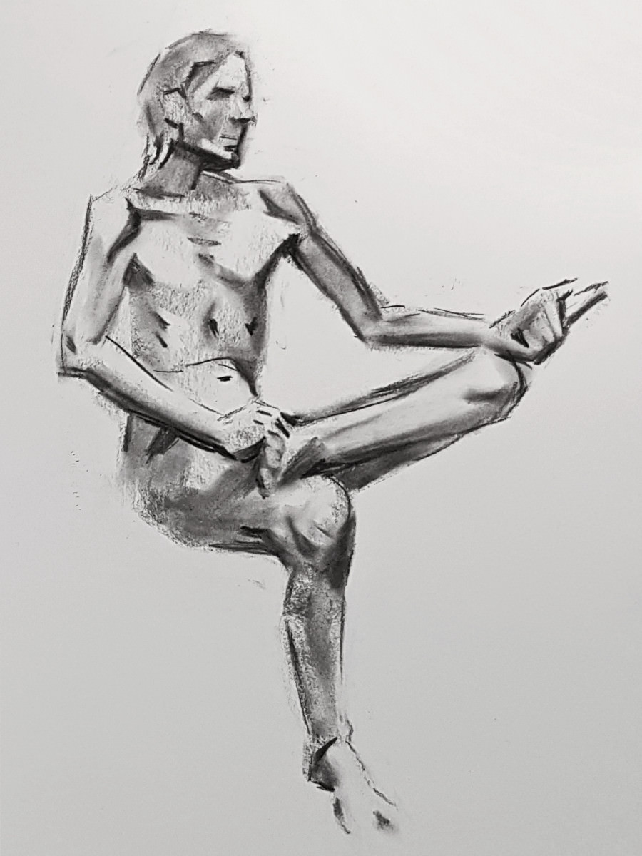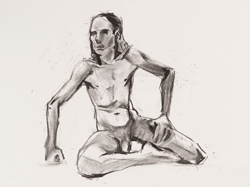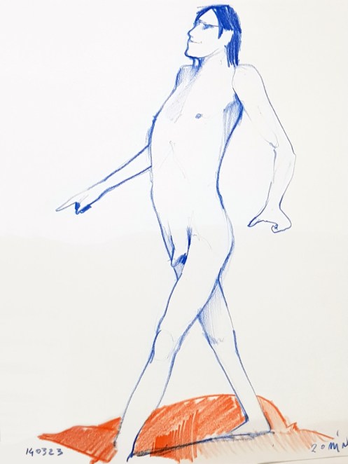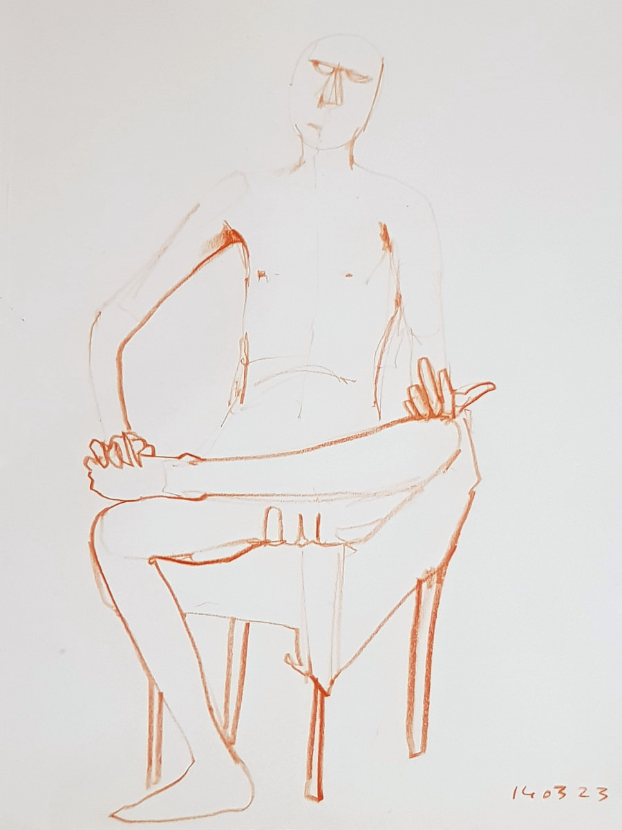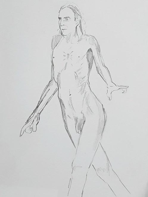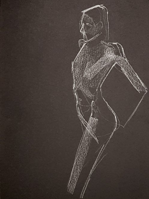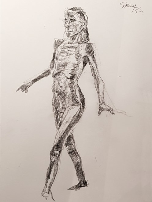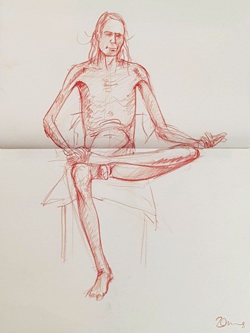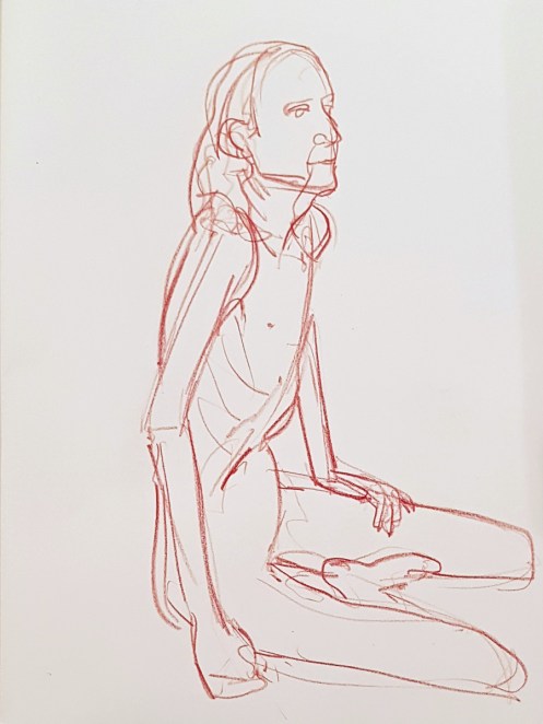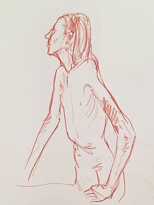 Whereas The Star’s pose lengths start at 5 minutes then dwindle all the way down to three of 30 seconds before increasing again, here they go up and up from the outset. This wasn’t the only difference; the best news is that Catherine is once more offering feedback, tips and informal tuition to the artists. My next pose: 20 minutes seated.