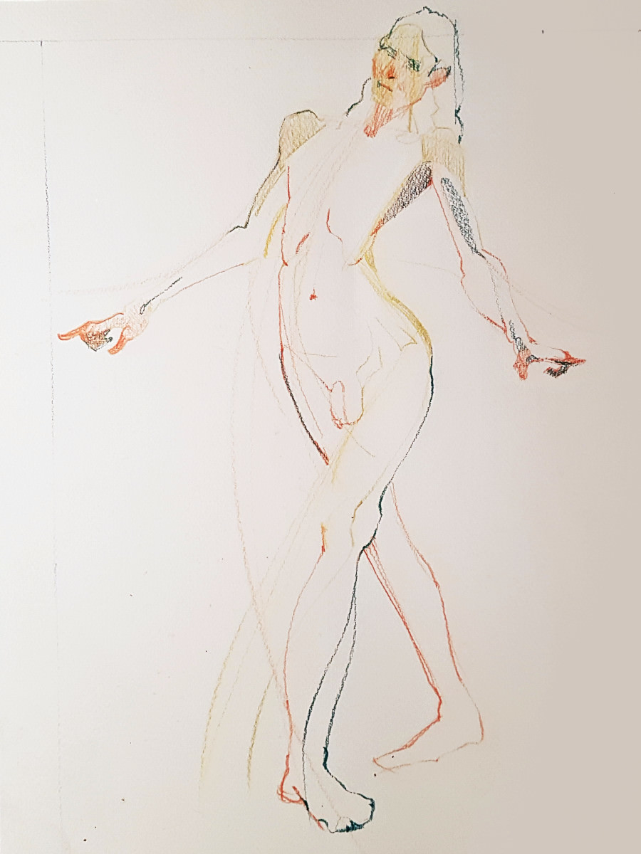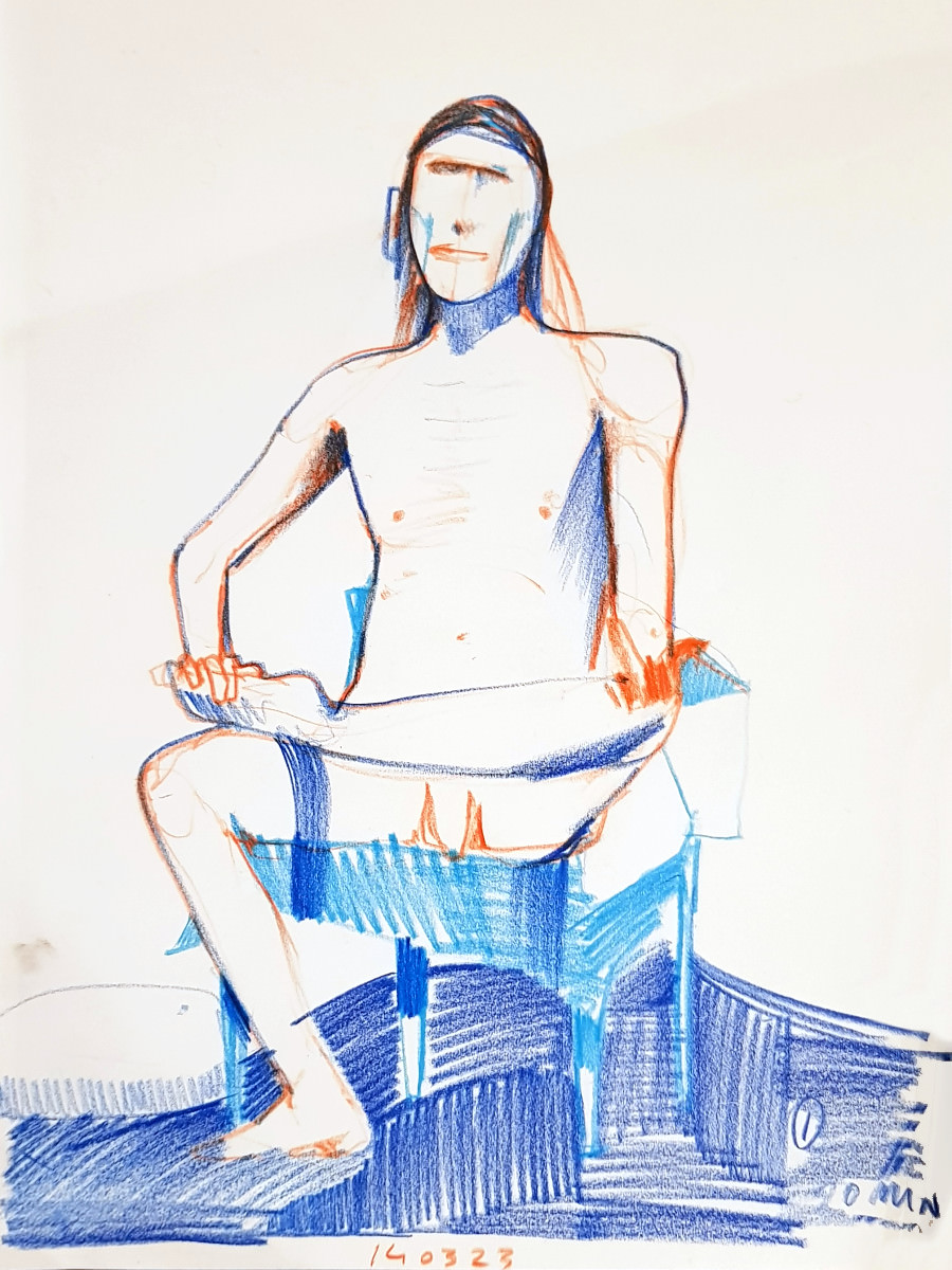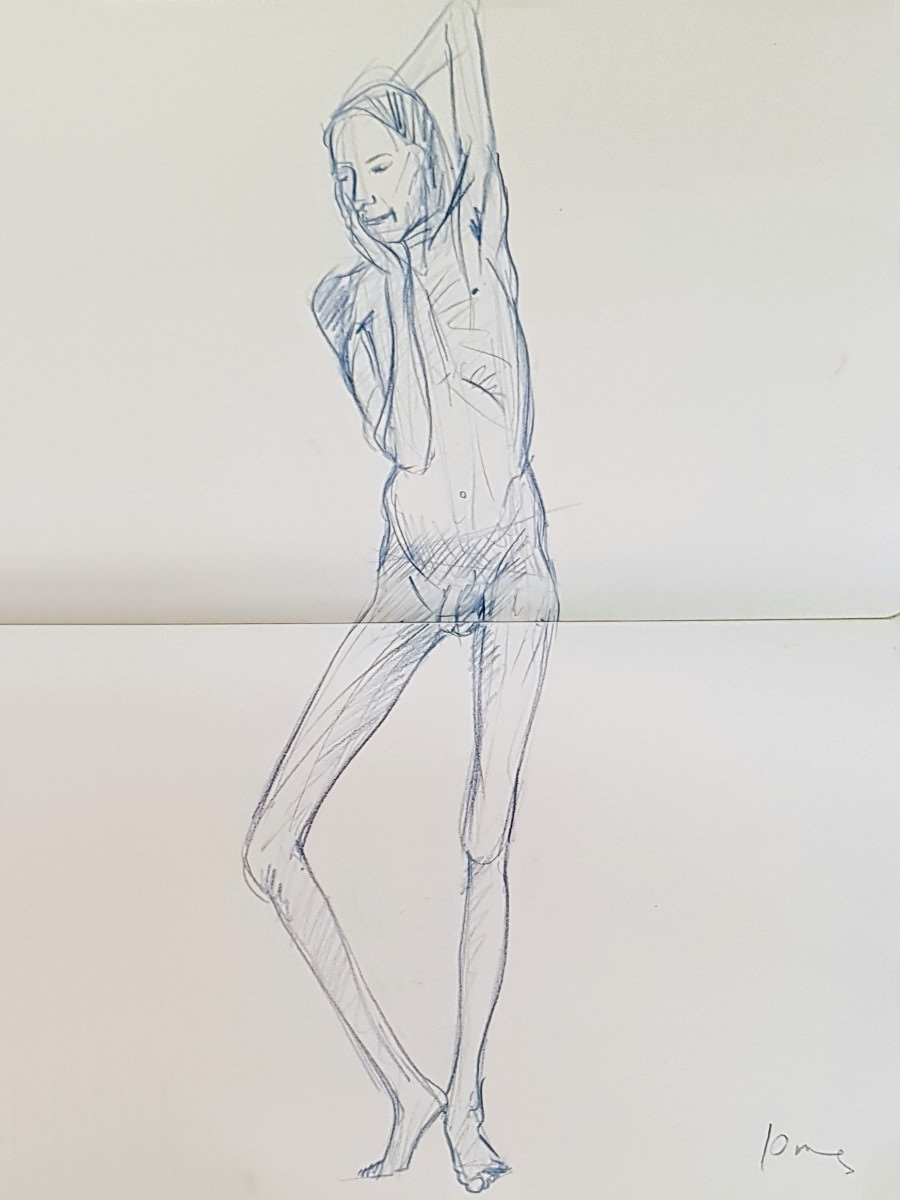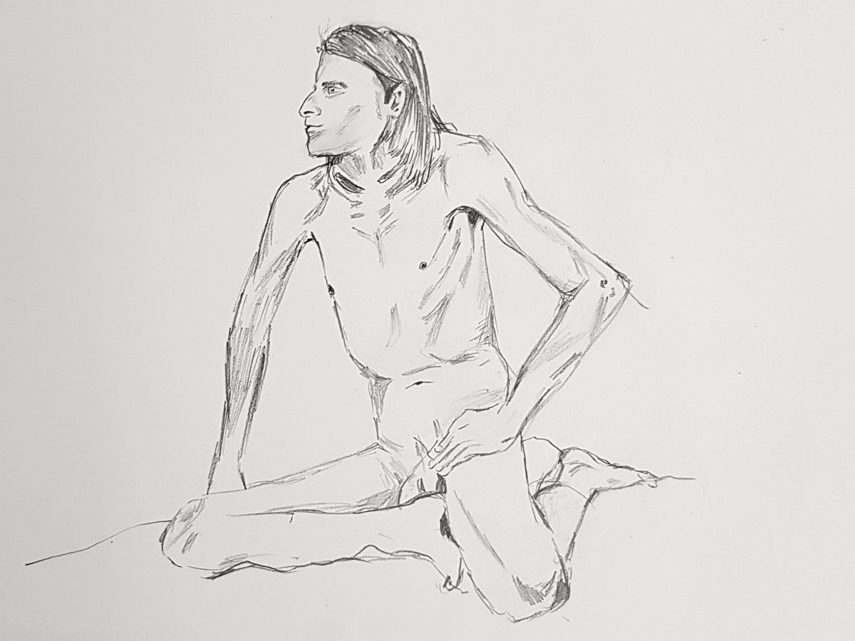 Whereas The Star’s pose lengths start at 5 minutes then dwindle all the way down to three of 30 seconds before increasing again, here they go up and up from the outset. This wasn’t the only difference; the best news is that Catherine is once more offering feedback, tips and informal tuition to the artists. My next pose: 20 minutes seated.