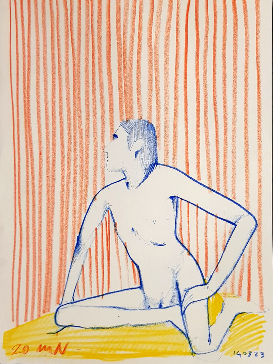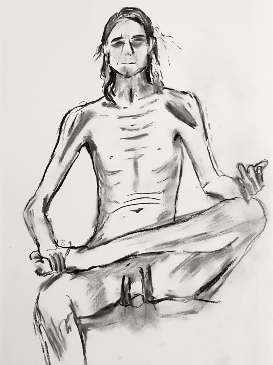 After a short break for refreshments, we completed this session with two more poses of 20 minutes each. For the first I stood with left leg a pace forward and arms out low on each side; for the last I sat upright with knees crooked on the floor, leaning slightly forward over my right thigh. Proven postures, both composed and sustainable.